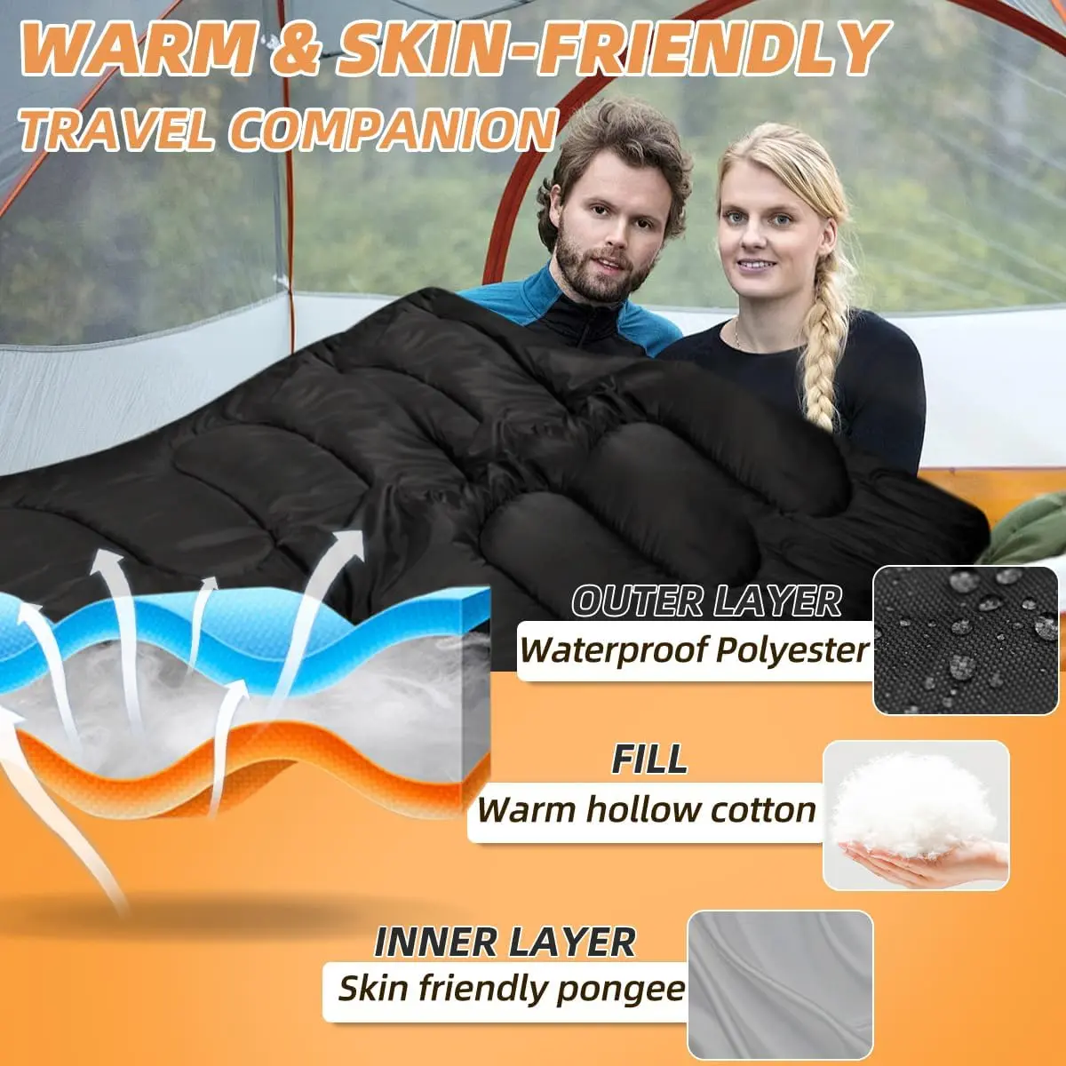 ·[COMFORTABLE AND WARM TRAVEL]: Filled with hollow cotton and thickened inside to ensure warmth, the sleeping bags for adults fit for cold weather & warm are suitable for environments between 5-15 degrees Celsius. Equipped with 2 pillows filled with plush, you can enjoy a comfortable sleeping experience during camping — even outdoors, you can enjoy a family sleeping experience