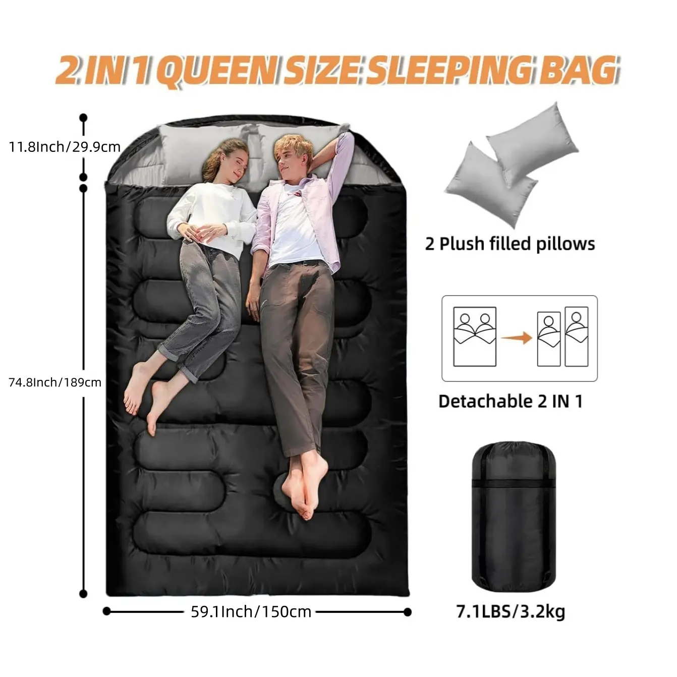·[GENEROUS SLEEPING SPACE]: Queen size sleeping bag provides spacious and comfortable space, allowing for easy adjustment of sleeping positions and free movement. It can easily accommodate 2 people up to 7 feet tall, making it perfect as travel products for couples, families, or partner