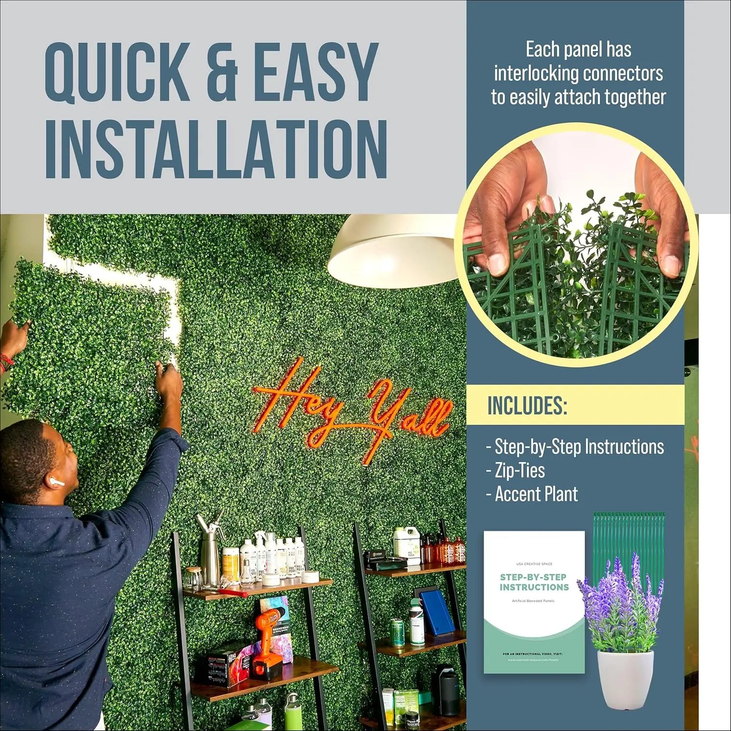 · DURABILITY: Our boxwood grass wall panels are weather resistant and eco-friendly, the high density polyethylene makes our super sturdy yet lightweight. Once installed, the grass wall requires little to none maintenance