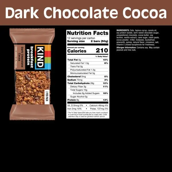 KIND Breakfast Protein Bars – Dark Chocolate Cocoa | Gluten-Free, Low Sodium, 8g Protein, 12 Count