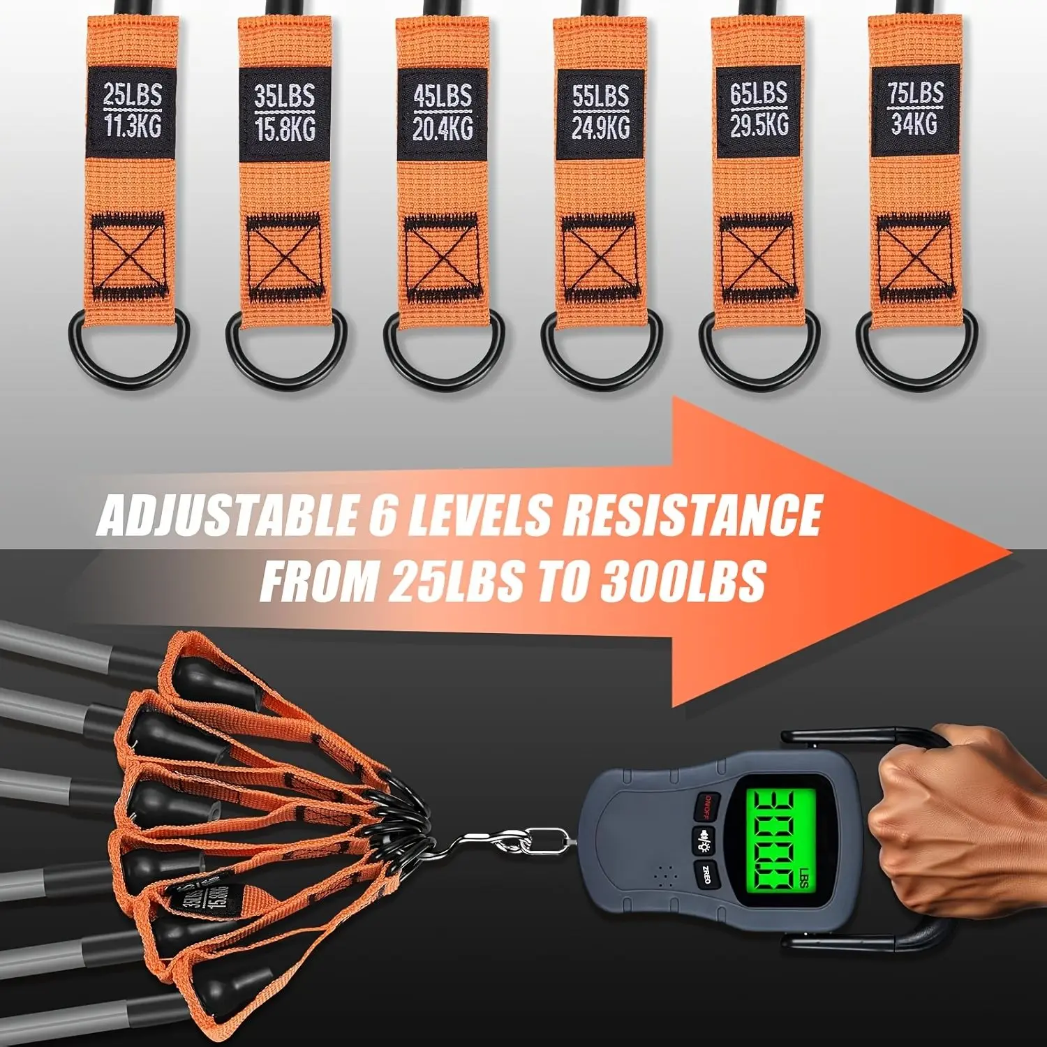 This set includes 6 interchangeable bands (25-75lbs per band), with a combined max resistance of 300LBS. Mix and match bands to tailor the intensity to your strength level, training goals, and exercise type. From warm-ups to max-effort lifts, this set adapts to your needs.