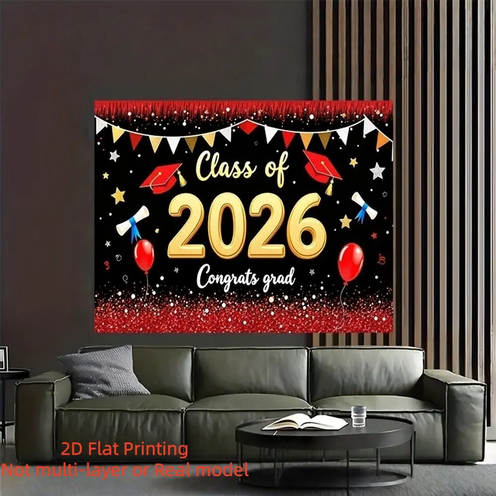 2D Flat Banner 2026 Graduation Backdrop, Red and Golden Glitter "Class of 2026" Design, Hanging Cloth for Graduation Photos & Indoor Wall Decoration