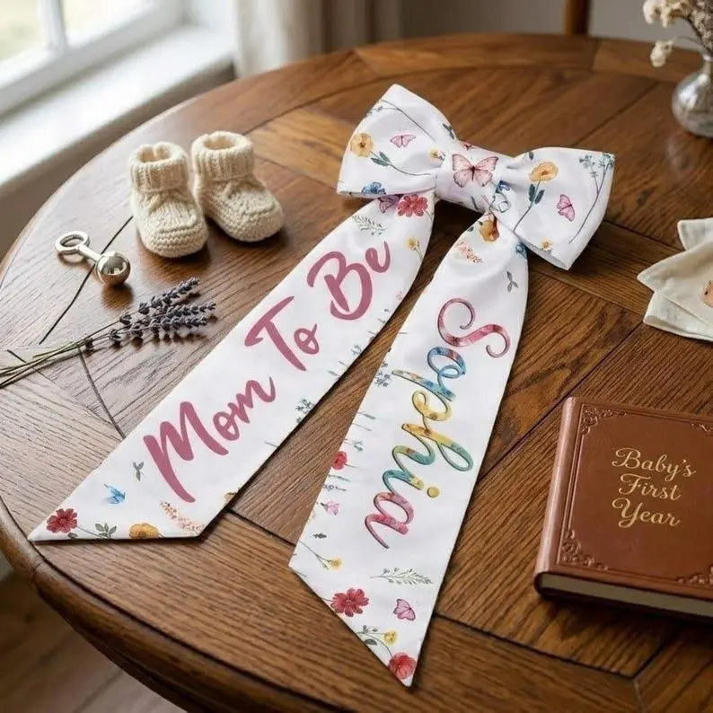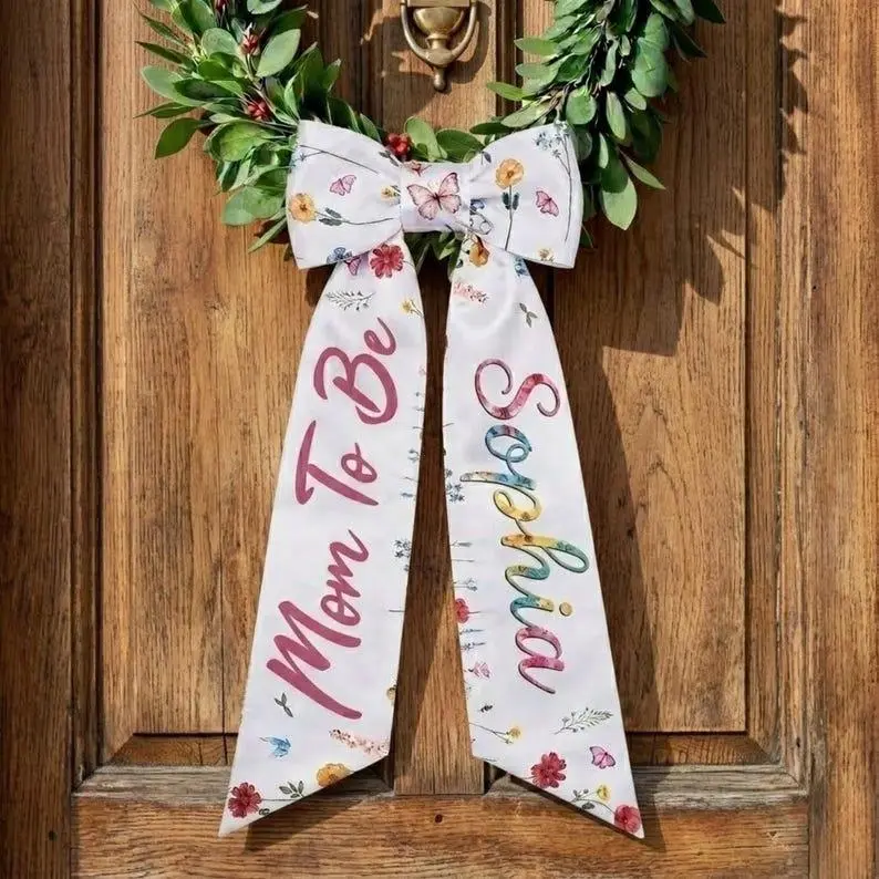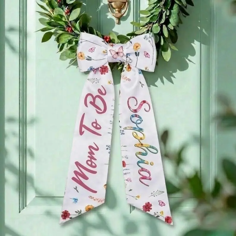 Personalized Mom To Be Door Sash, Custom Name Floral Wreath Ribbon, Baby Shower Gift, Gender Reveal & Nursery Decor