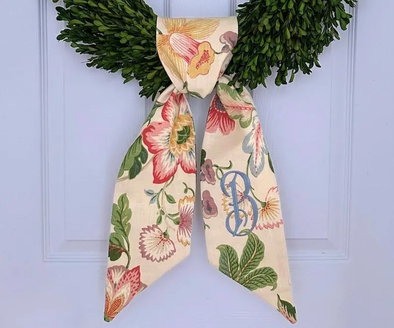 5. Monogram floral chinoiserie green wreath sash for front door, personalized embroidered fall autumn wreath sash, custom wedding & shower gift