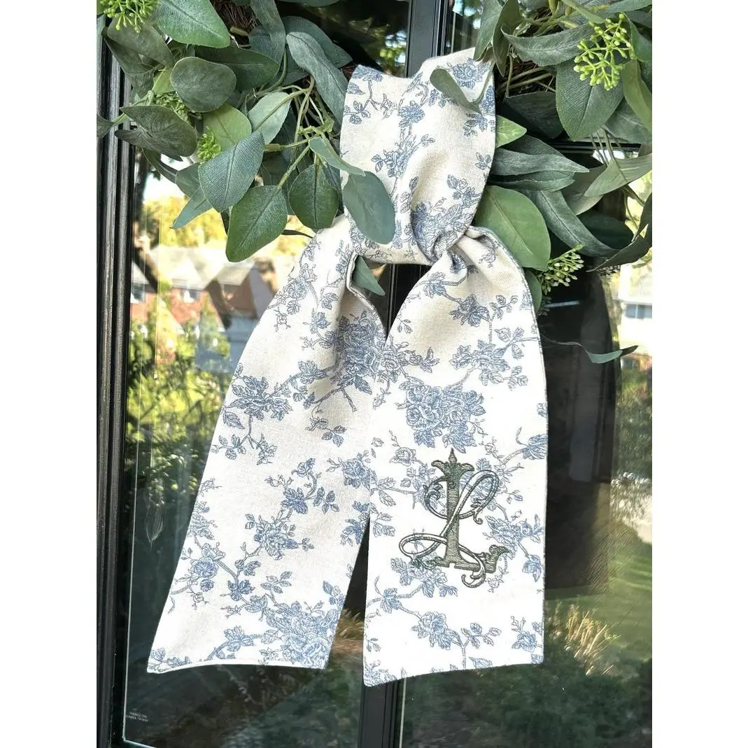 5. Vintage Blue Floral Classic Embroidered Wreath Sash | Personalized | Monogrammed | Cotton | Housewarming | Wedding | Summer | Blue White