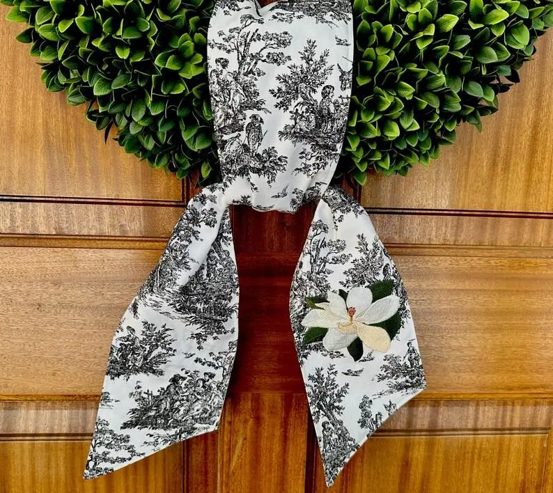 5. Personalized Magnolia Wreath Sash: Black Toile Chinoiserie Monogram Swag