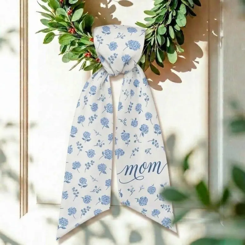 Mother's Day Wreath Sash Door, Mom Floral Wreath Sash, Blue Floral Door Wreath Bow, Mother's Day Front Door Decor, Spring Wreath Ribbon