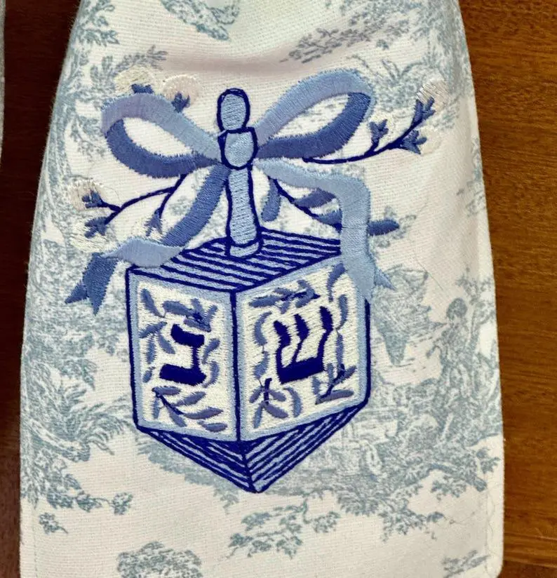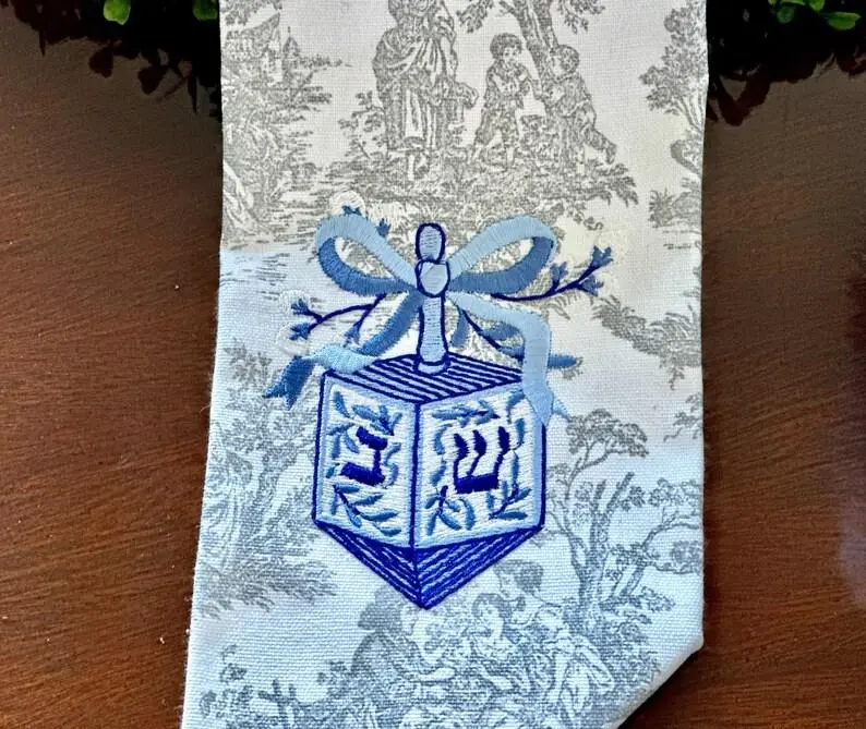 5. Custom pale blue Hanukkah dreidel wreath sash, personalized holiday toile swag, monogrammed wreath scarf