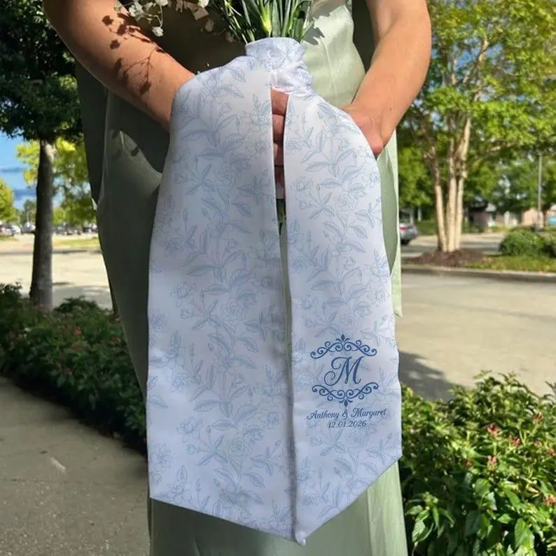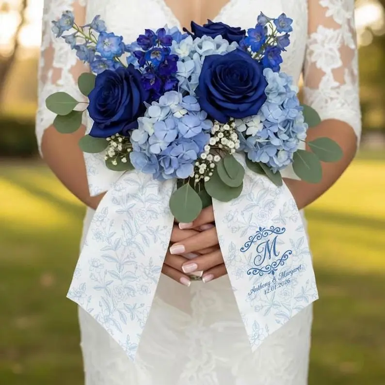 Custom Wedding Bouquet Sash, Floral Printed Ribbon, Personalized Monogram Ribbon