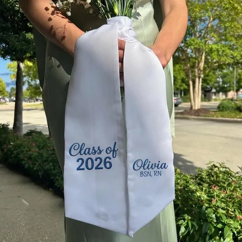 5. Personalized Embroidered Bouquet Sash, White Satin Ribbon, Nursing Graduation