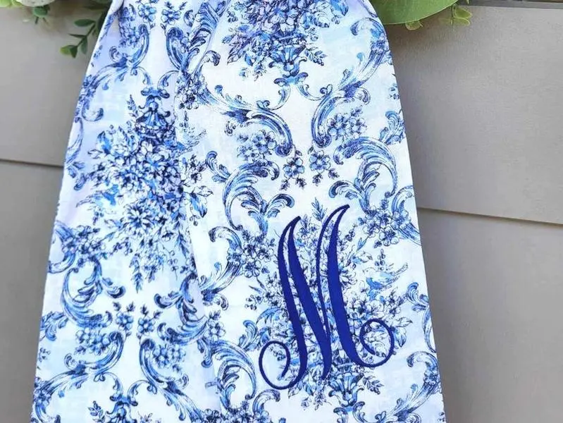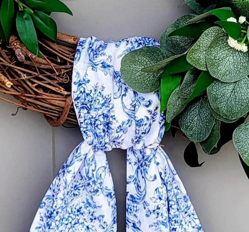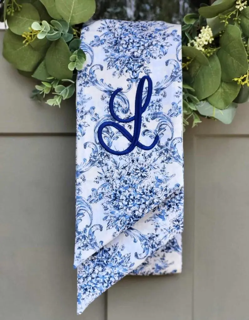 5. Chinoiserie Wreath Sash Floral Scarf for Front Door Embroidered Wreath Ribbon Personalized Wreath Sash Blue Chinoiserie Monogram Embroidery