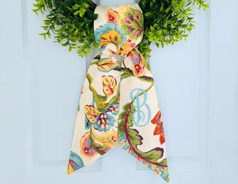 5. Monogram floral green chinoiserie wreath sash for front door, personalized embroidered spring Easter wreath sash, custom wedding shower gift