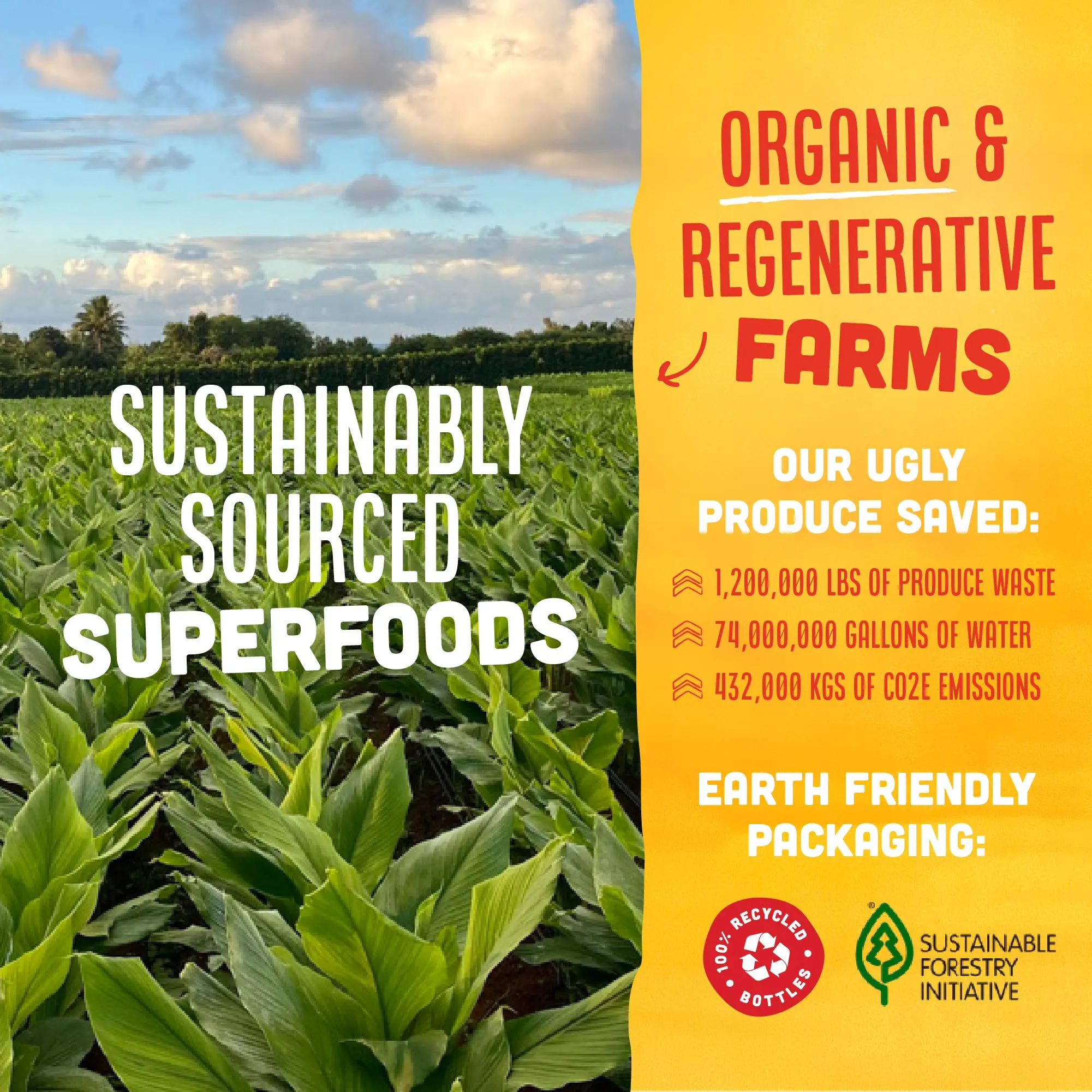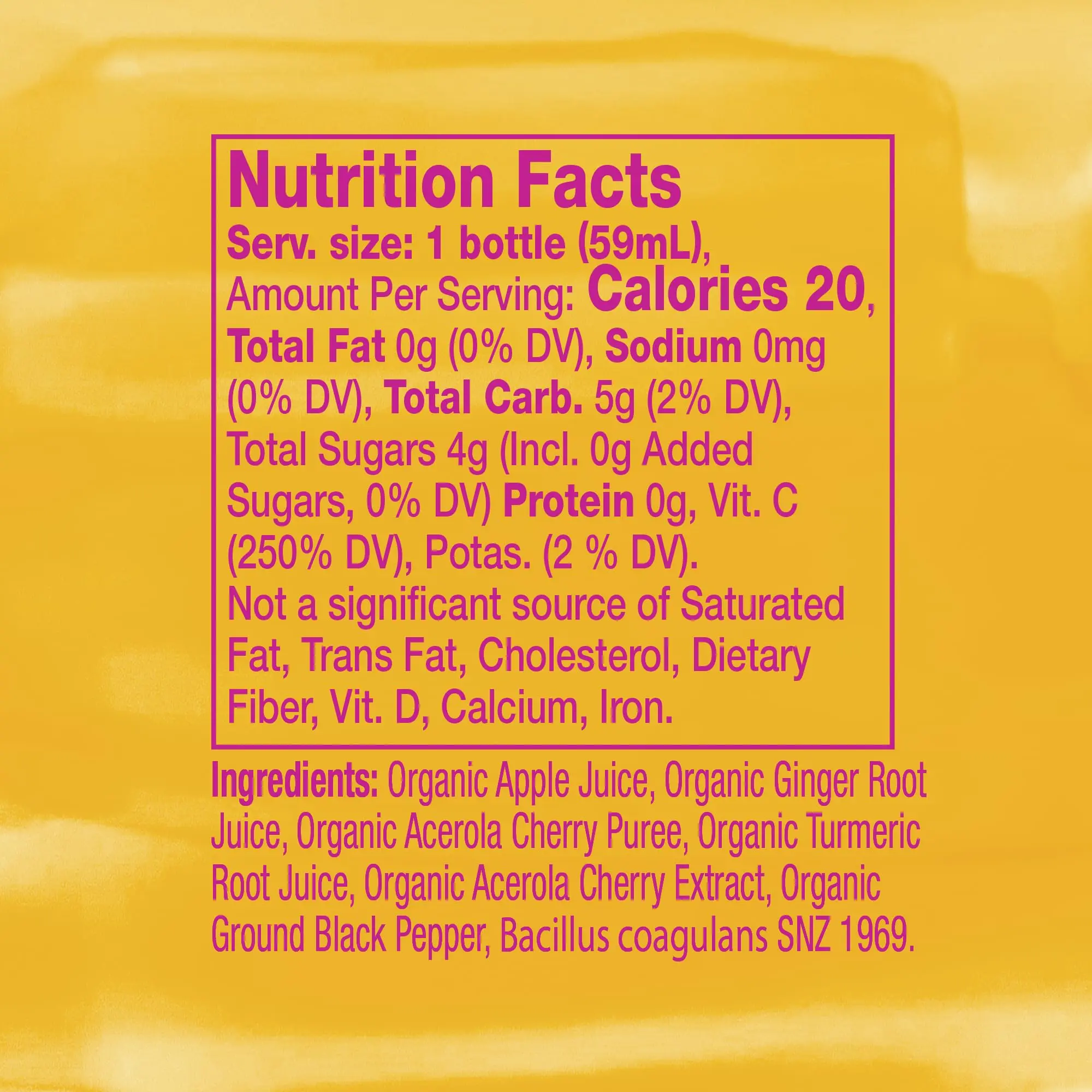 ·Potent immunity booster. A kick you can feel with superfoods ginger, turmeric, and acerola cherry. No sugar added, no artificial ingredients or colors, no water added.