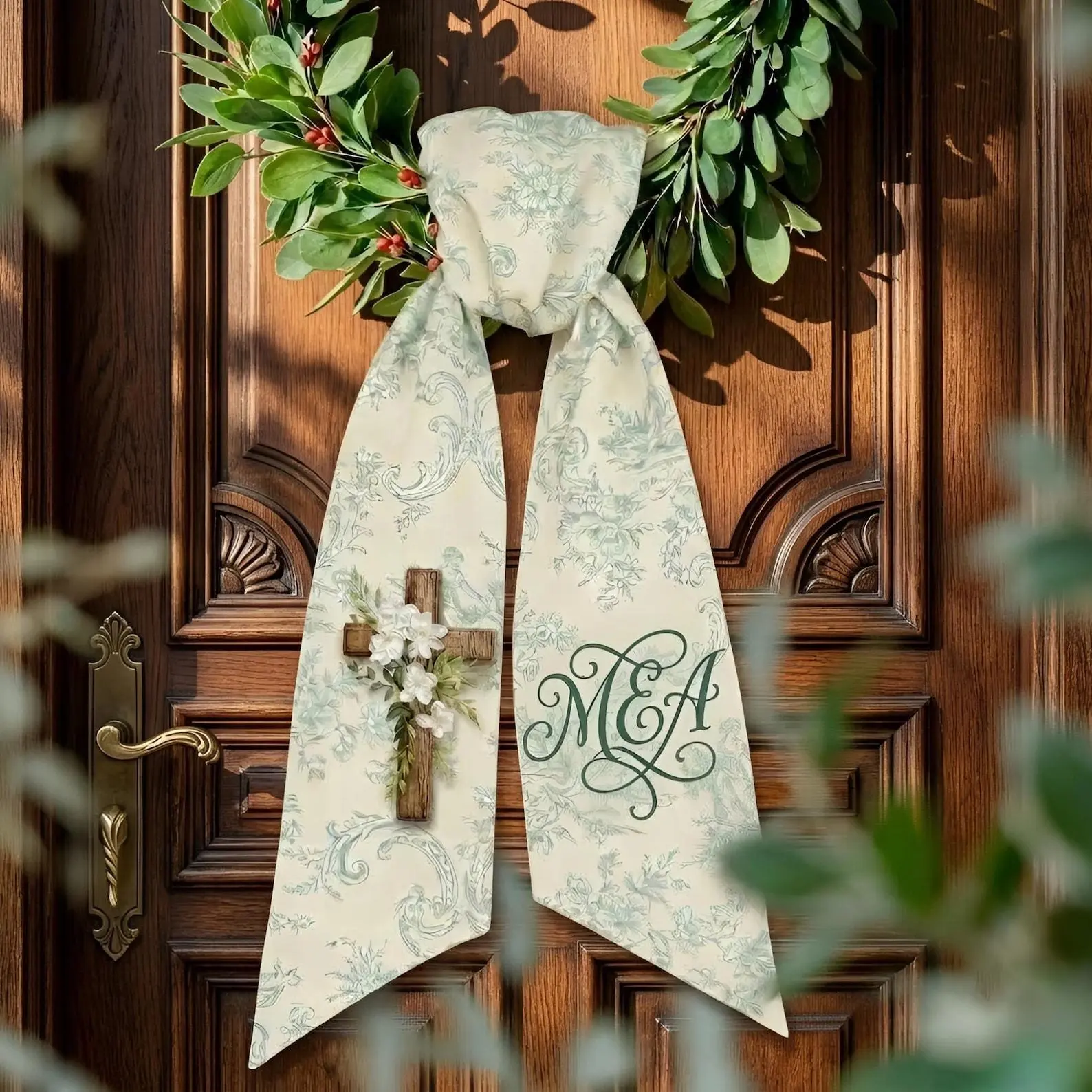 Personalized Wreath Sash Door, Custom Monogram Door Sash, Farmhouse Cross Wreath Bow, Christian Front Door Decor