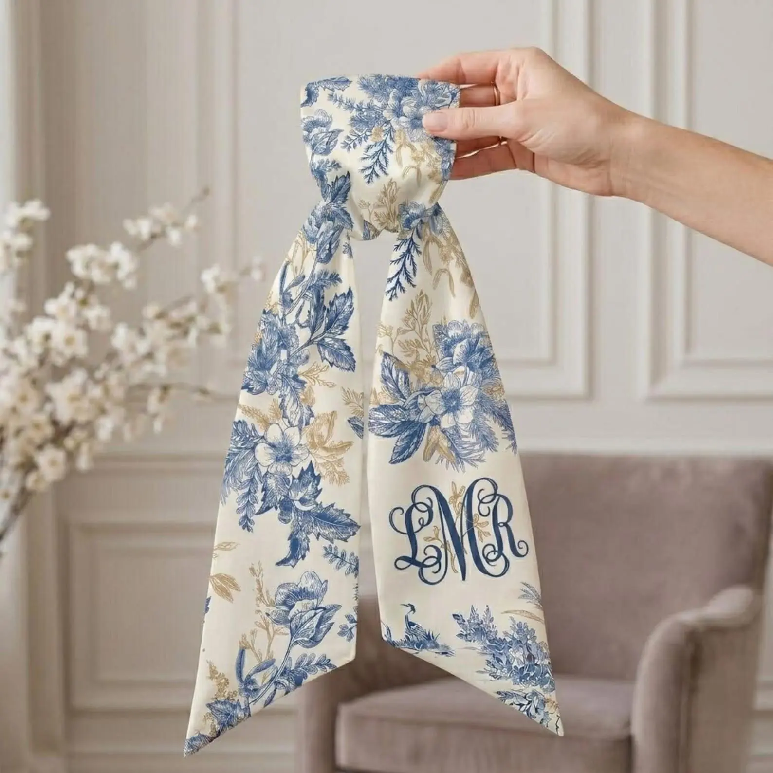 Monogrammed Wreath Sash, Blue White Toile Door Decor, Personalized Floral Wreath Sash, Custom Wedding Gift, Mother's Day Gift