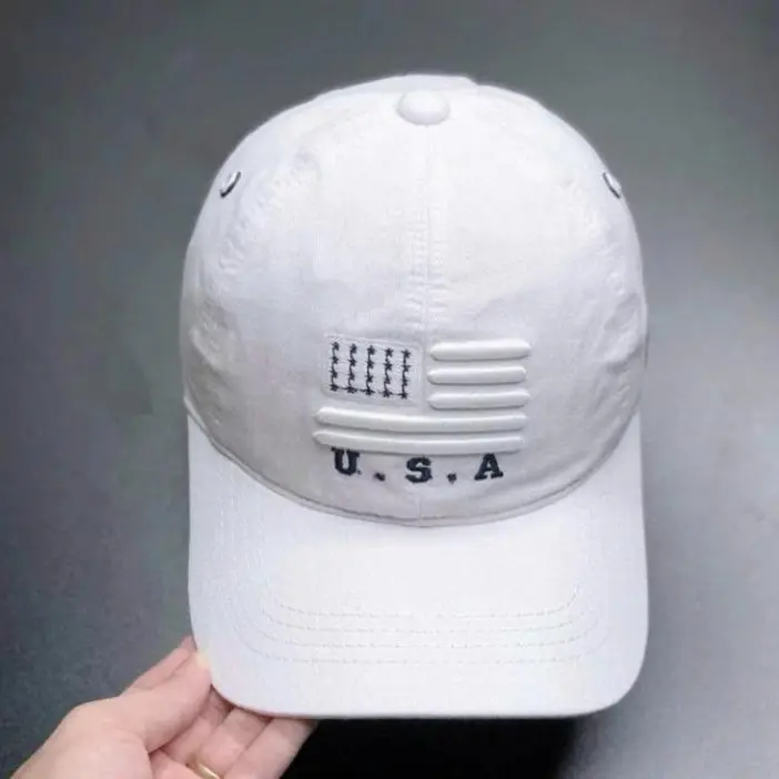 Clean Patriotic Style A white baseball cap featuring a minimalist USA flag embroidery, perfect for everyday wear and classic American style.