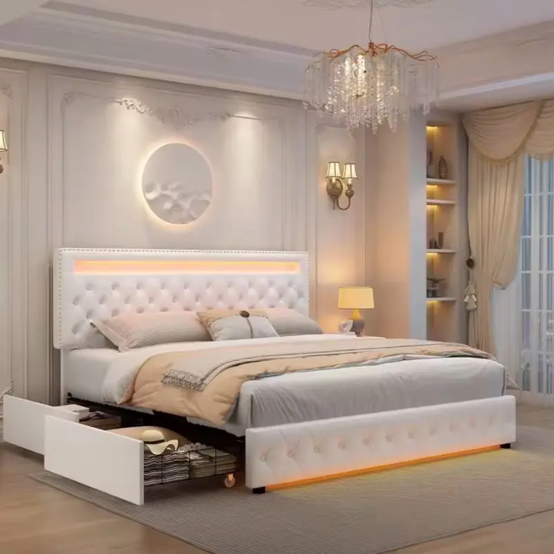 Nailhead Trim Upgrade your space with a stylish padded headboard finished with elegant silver studs. White Led bed frame perfect for contemporary bedrooms that need a touch of glam.