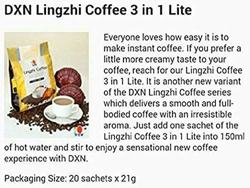 ·Everyone loves how easy it is to make instant coffee. If you prefer a little more creamy taste to your coffee, reach for our Lingzhi Coffee 3 in 1 Lite. It is another new variant of the DXN Lingzhi Coffee series which delivers a smooth and full-bodied coffee with an irresistible aroma. Just add one sachet of the Lingzhi Coffee 3 in 1 Lite into 150ml of hot water and stir to enjoy a sensational new coffee experience with DXN.