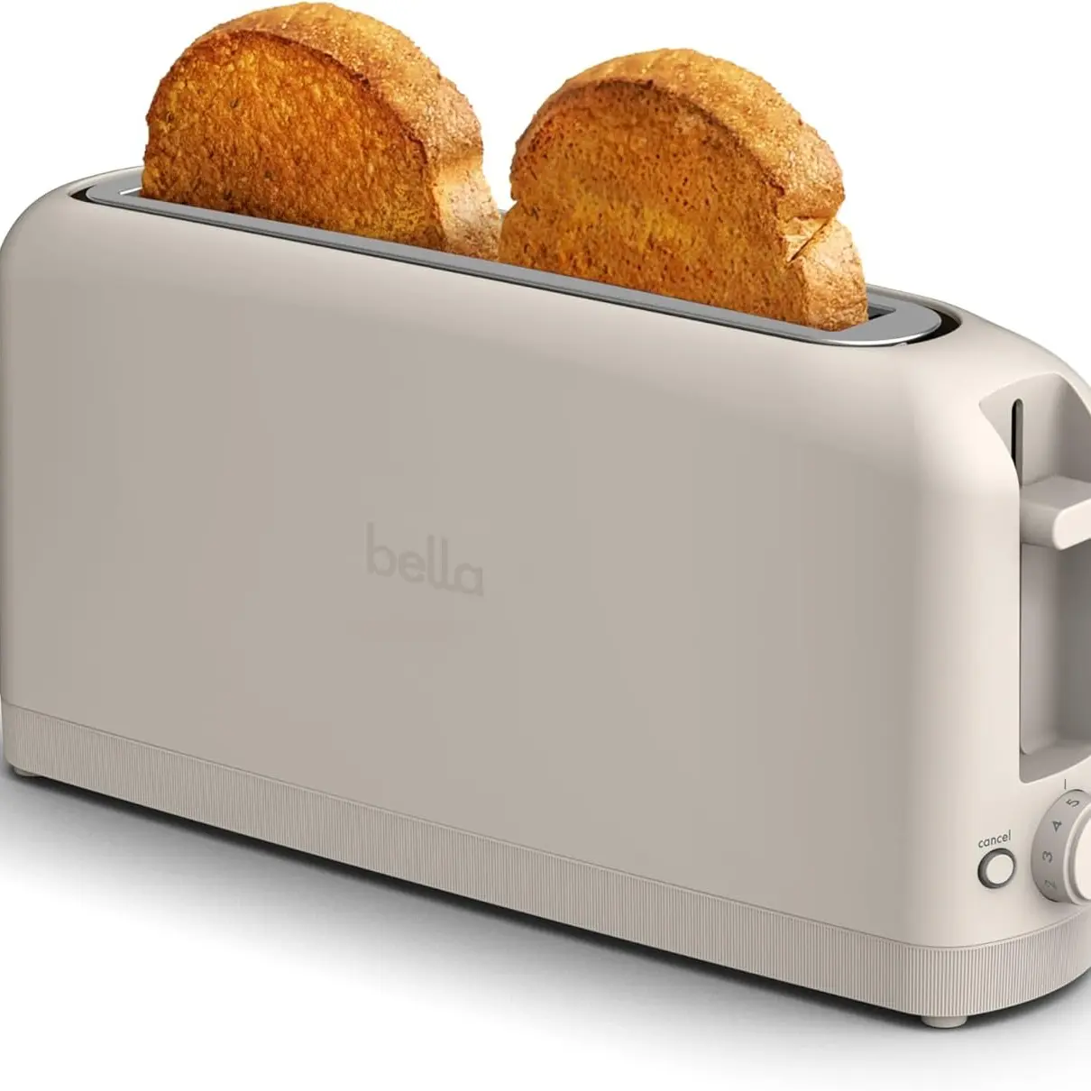 ·Introducing the bella 2-Slice Slim Toaster, where innovative design meets ultimate functionality. With a unique 10-inch long slot, this bagel toaster effortlessly accommodates two slices of square bread side by side or a variety of artisanal breads, sourdough, bagels, baguettes, and thick Texas-style toast. The wide toasting space and slim 3.58" profile make it a perfect fit for any kitchen, combining versatility with space-saving efficiency. Control your toast exactly the way you like it with the 6-setting shade selector, plus Reheat and Cancel functions for precise browning. The high lift lever ensures easy access to smaller items like English muffins, while the auto-centering guides keep everything perfectly aligned for even toasting every time. Cleaning this toastie maker is a breeze with the removable slide-out crumb tray, and the anti-jam and auto shut off features provide added safety and peace of mind. Powered by a 900-watt toasting system, this toaster delivers quick and consistent results. Available in five stylish bella colors—Oatmilk, Surf, Plum, Seaglass, and Blossom—the long slot toaster is a modern, practical addition to any kitchen, offering both functionality and aesthetic appeal.