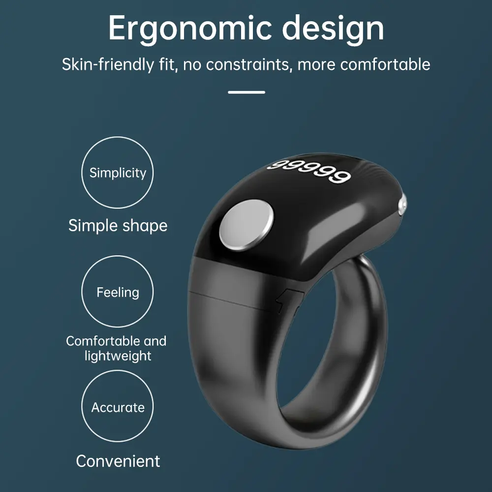 Features:  1.Portable counter precision buttons, accurate counting, and long button lifespan. 2.Equipped with self-locking function to avoid data loss caused by misoperation. 3.Oled display screen, displaying battery level, time, date, and count. 4.Type-c charging, long-lasting battery life, built-in 75mah rechargeable battery. 5.The ring has three adjustable gears, which is convenient and practical.