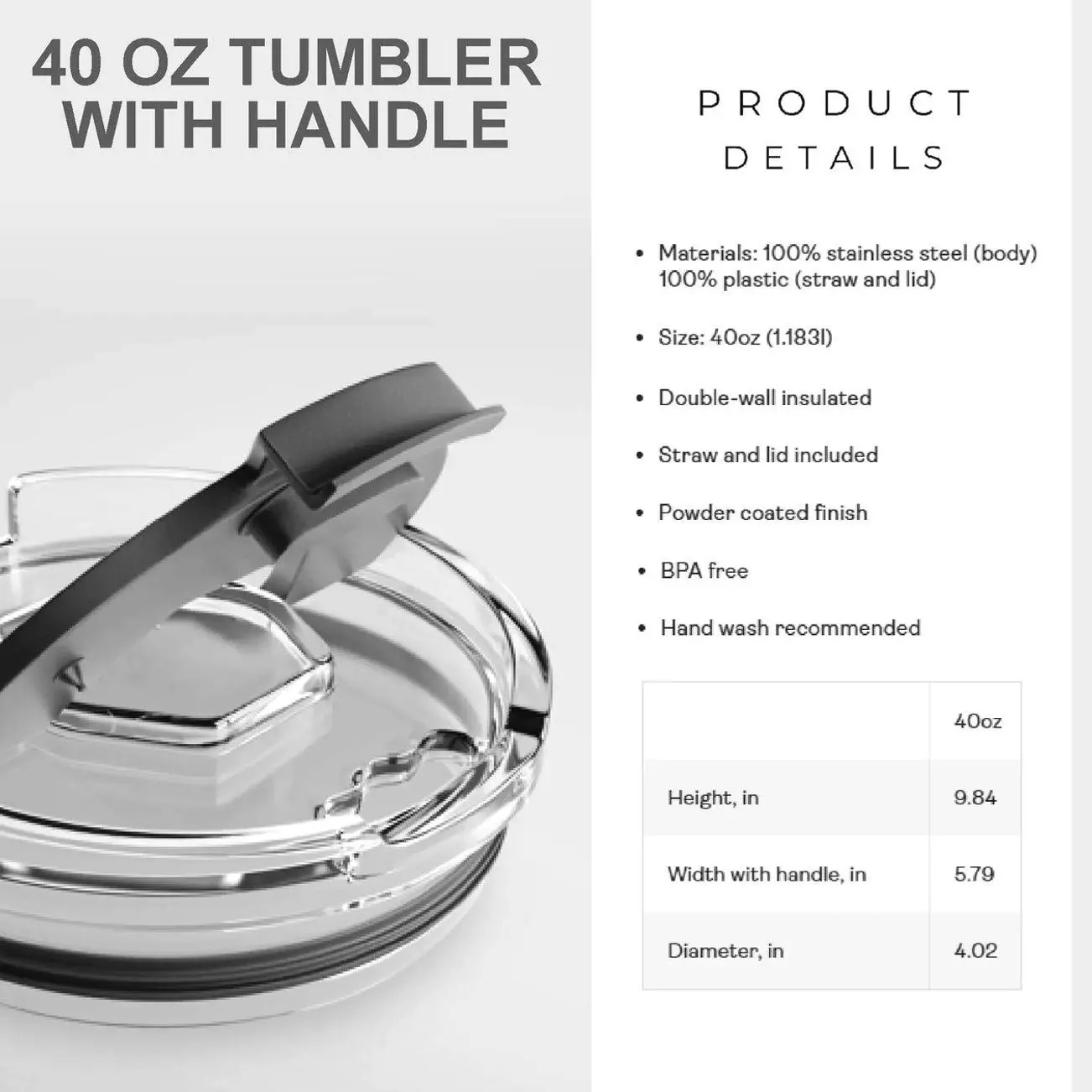 Ergonomic Handle (40oz): Designed for easy carrying all day long.