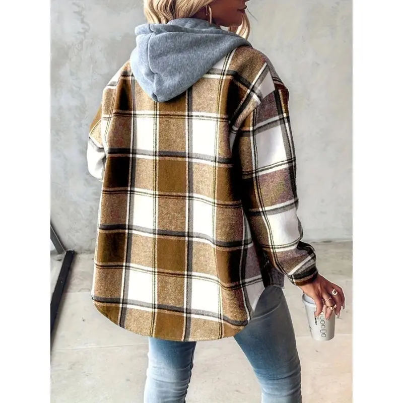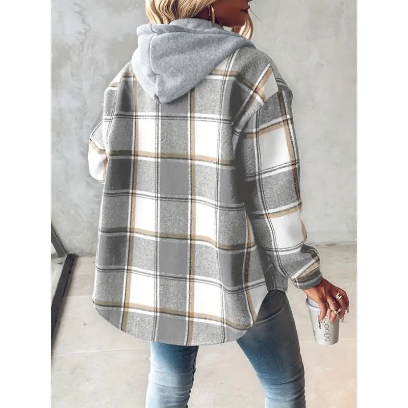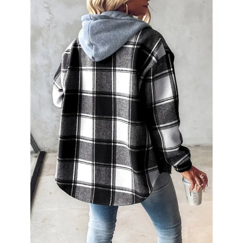 [Plaid Shacket] Warm Plaid Long Sleeve Shacket/✨Product Overview✨/The [Plaid Shacket] is a warm plaid long sleeve shacket, perfect for spring and fall. It features a button fleece-lined hooded design, made from 97% polyester and 3% elastane. The shacket is casual, with no fabric elasticity and random printing. It includes a drawstring for adjustable fit. Machine washable, but do not dry clean. /Material and Details🧵/Style and Care🌟