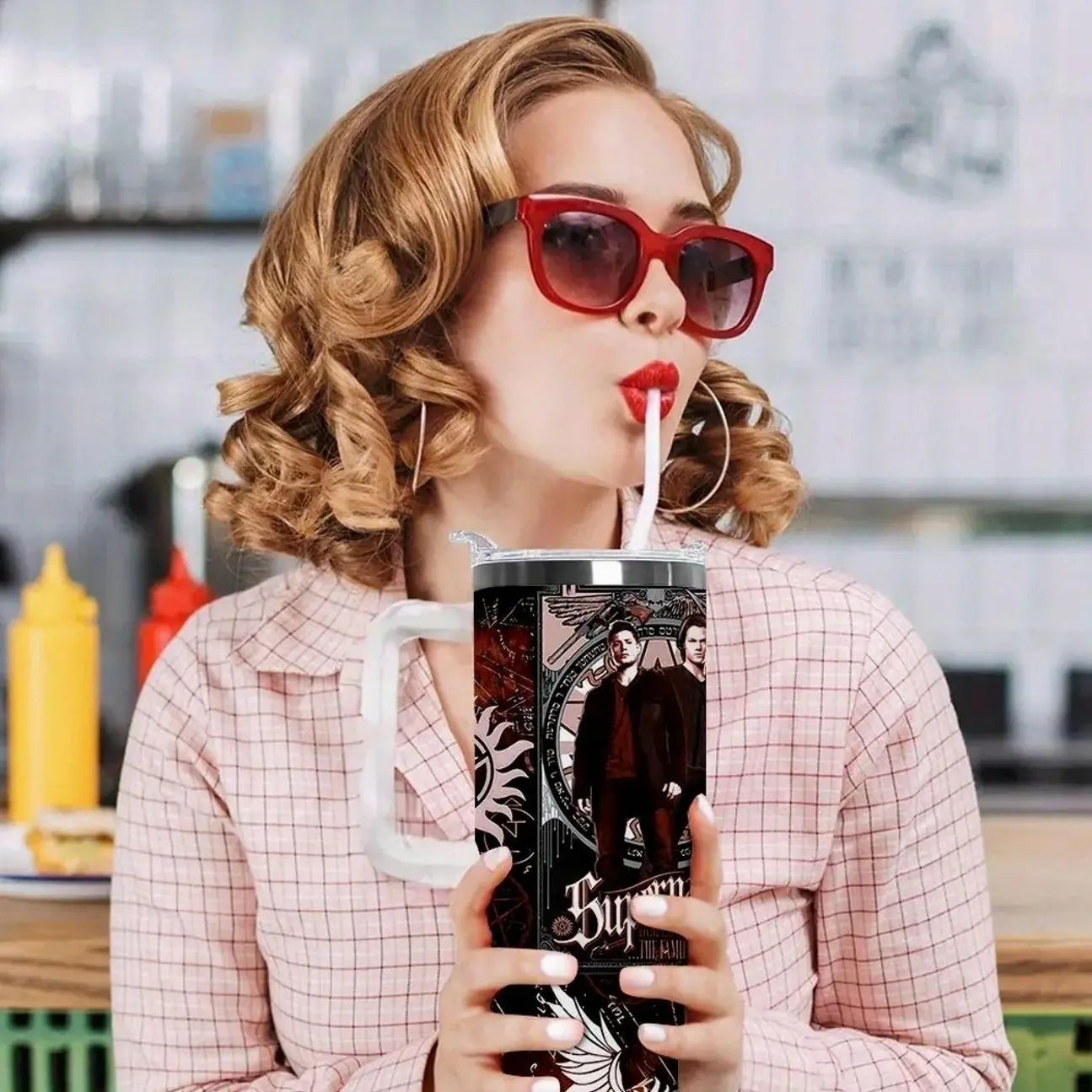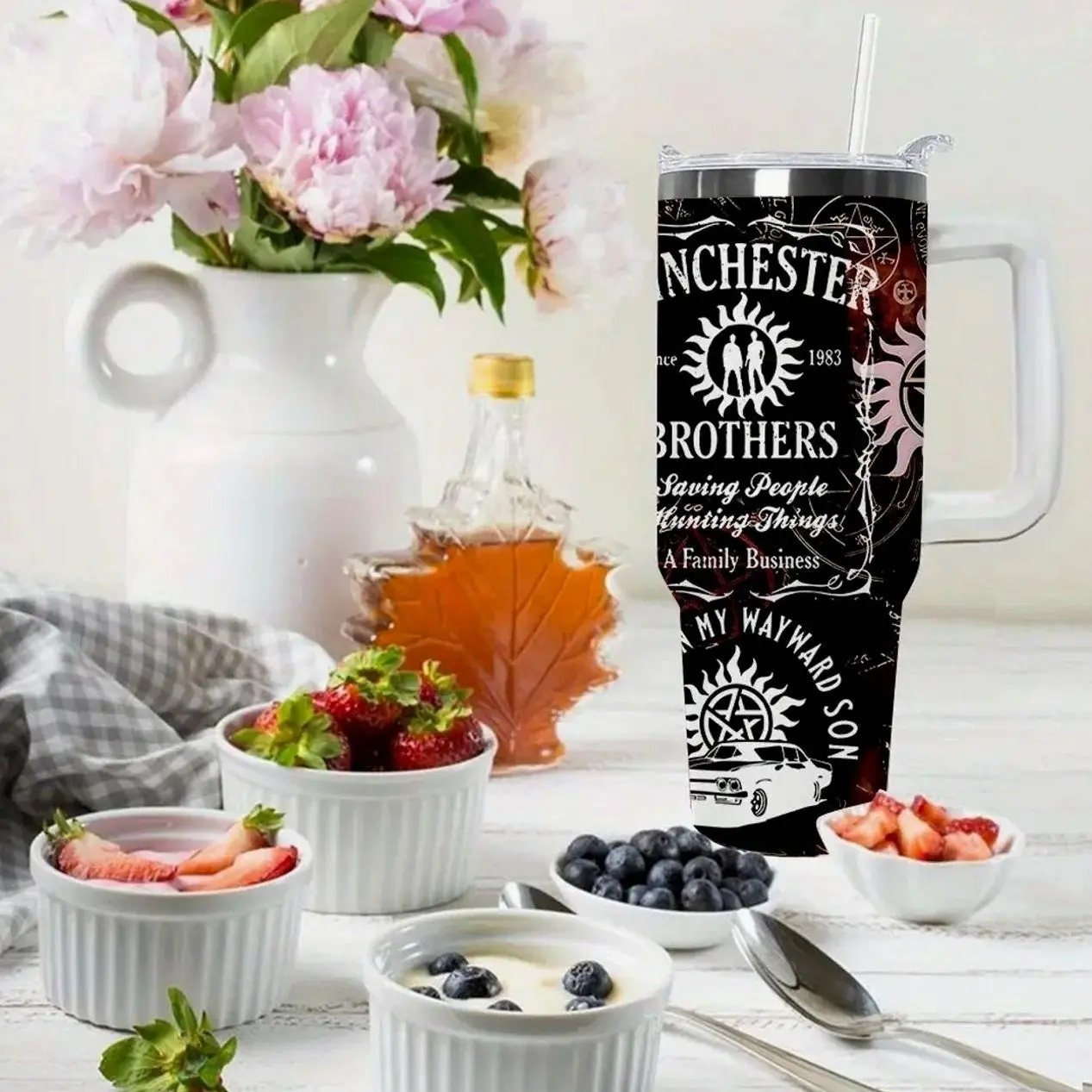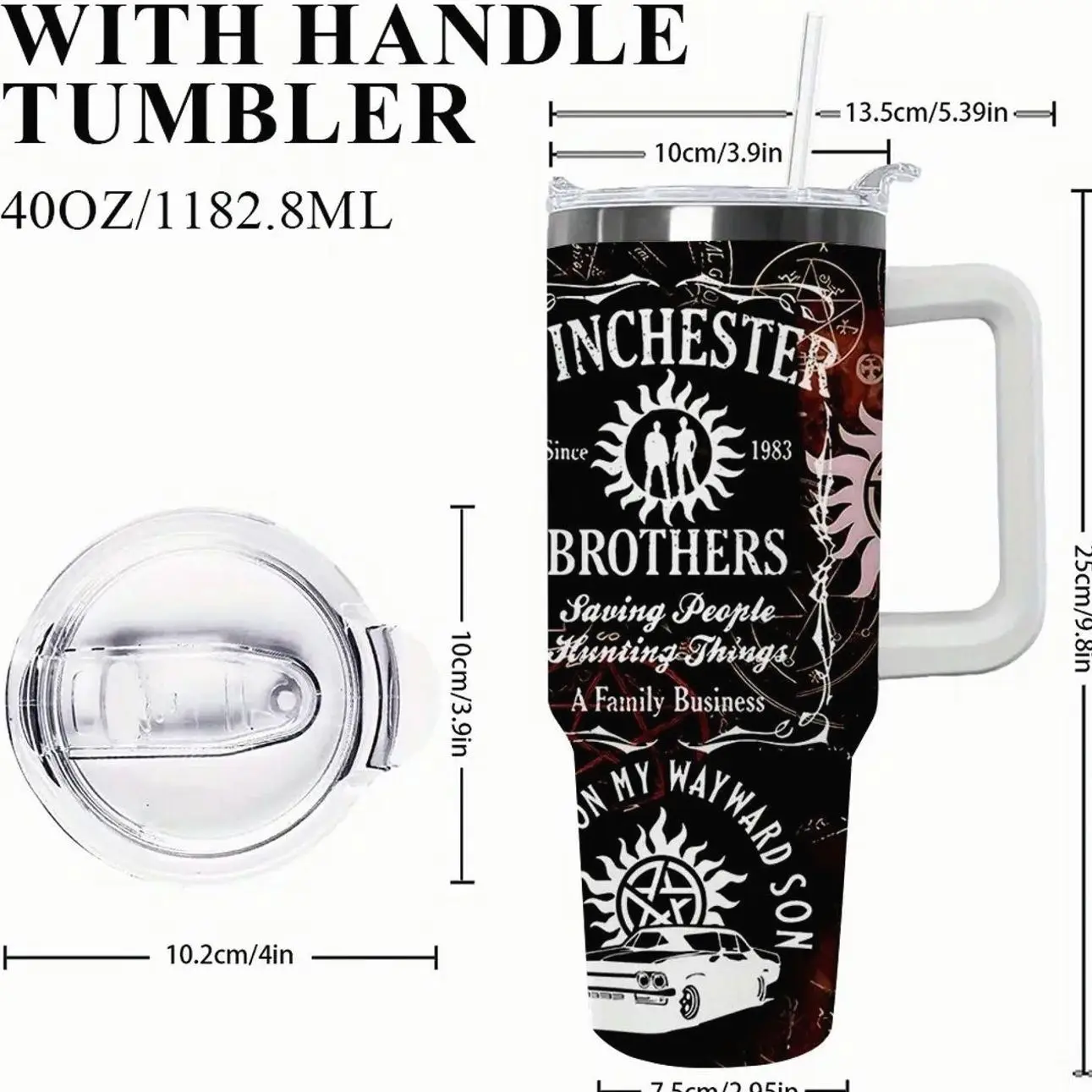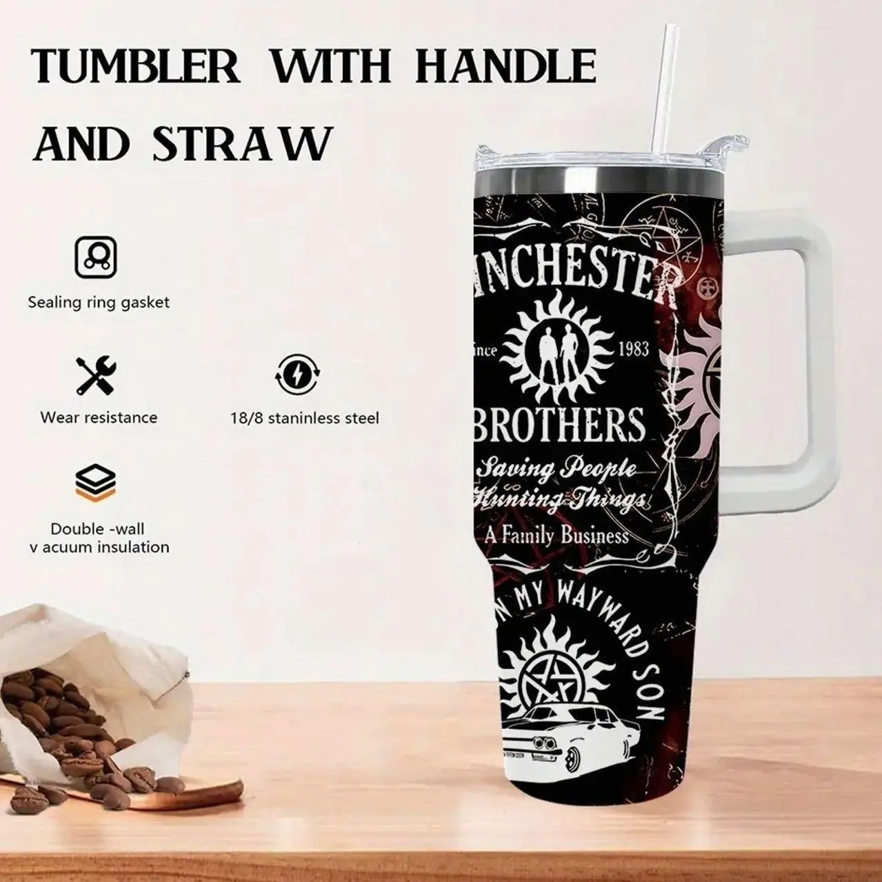 1 Piece Lyrichard 40 oz < Supernatural > TV Series Inspired Thermos Cup - Retro Winchester Brothers Design (With Handle, Leak-Proof Double-Wall Insulation, Can Keep Drinks Hot or Cold for a Long Time, 304 Stainless Steel Travel Cup