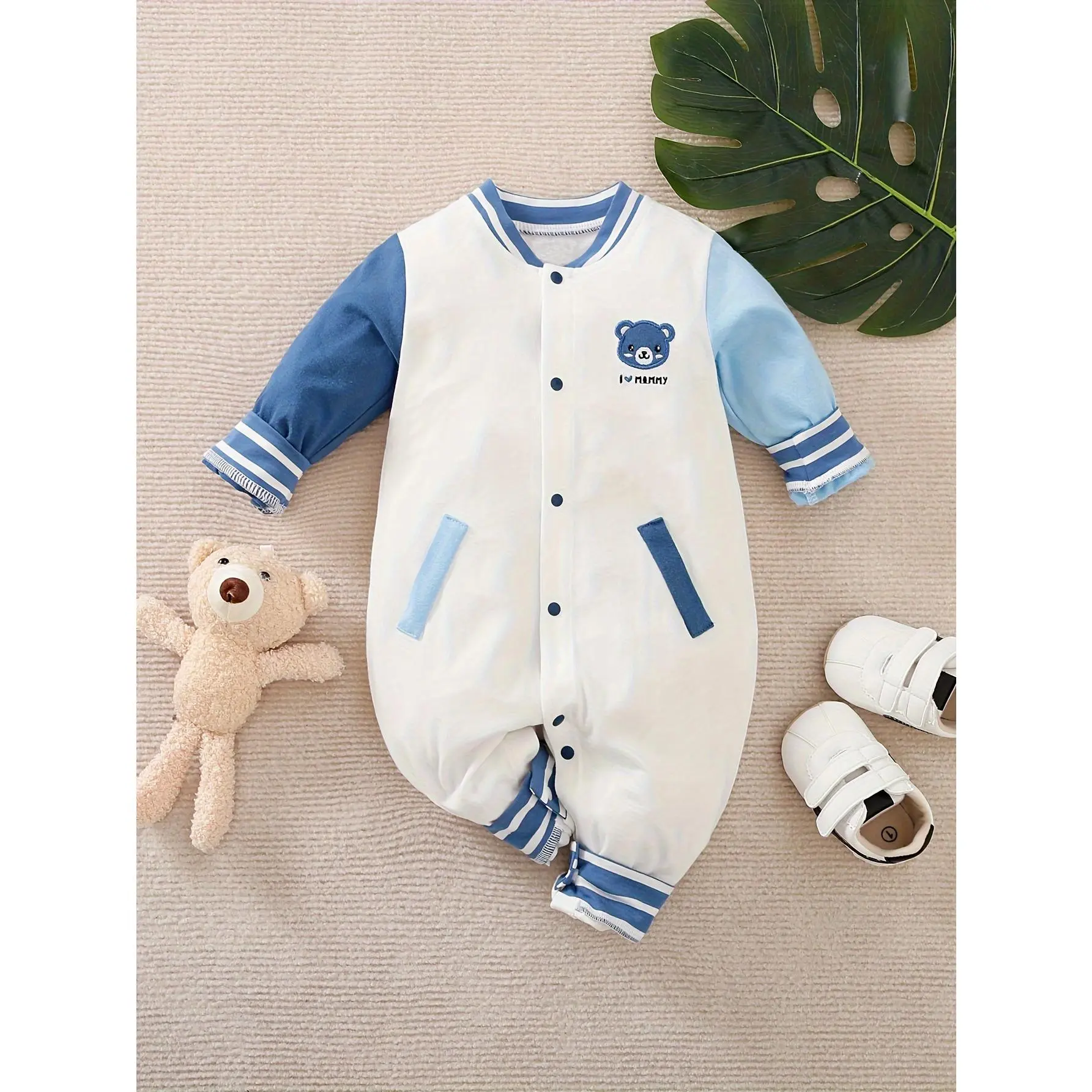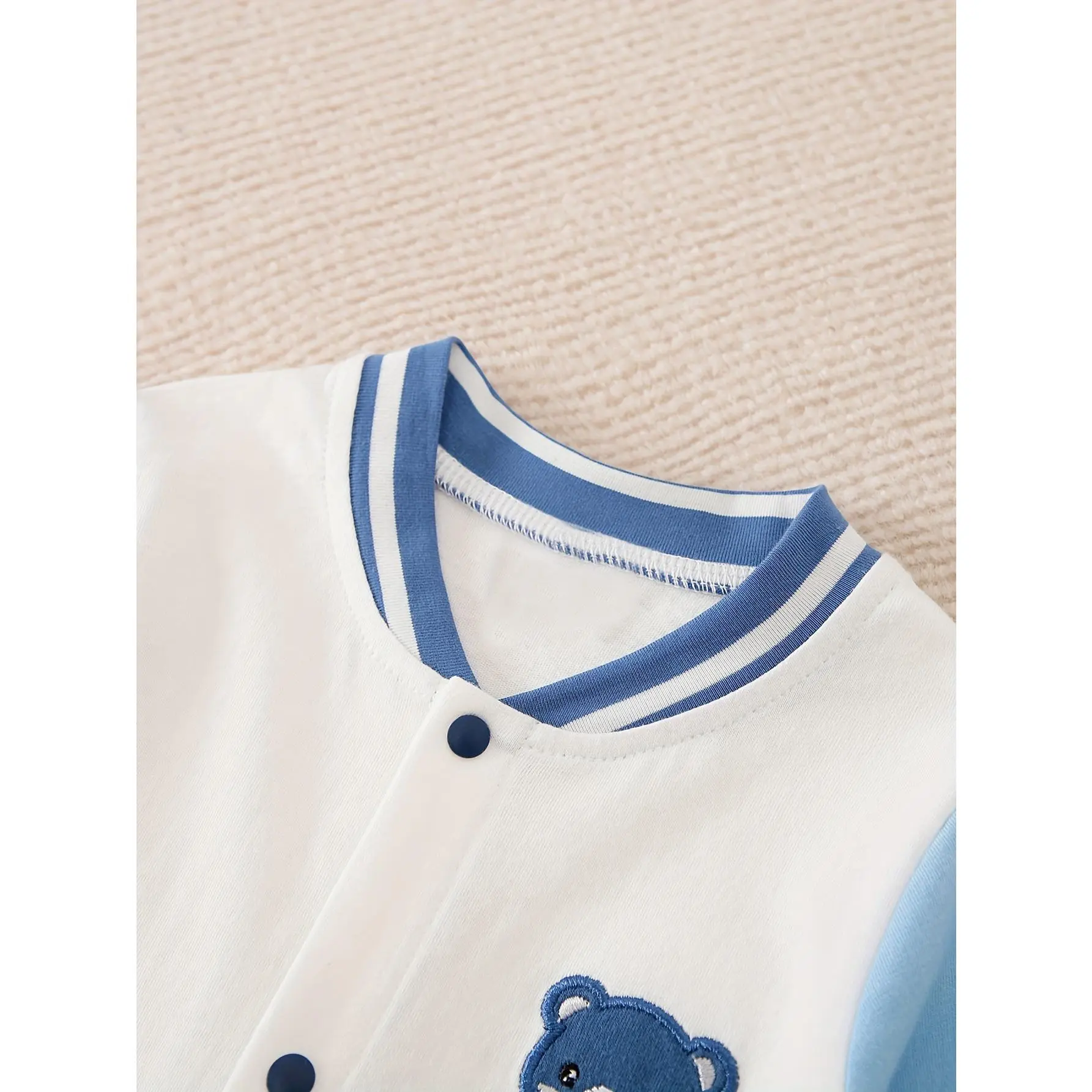 Spring and Autumn Newborn Long-Sleeve Bodysuit Blue and White Bear Baseball Jacket Bodysuit, Perfect for Outdoor