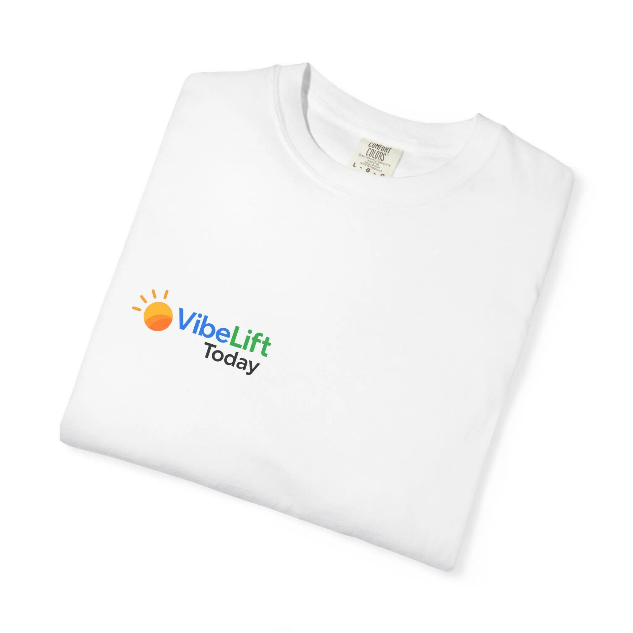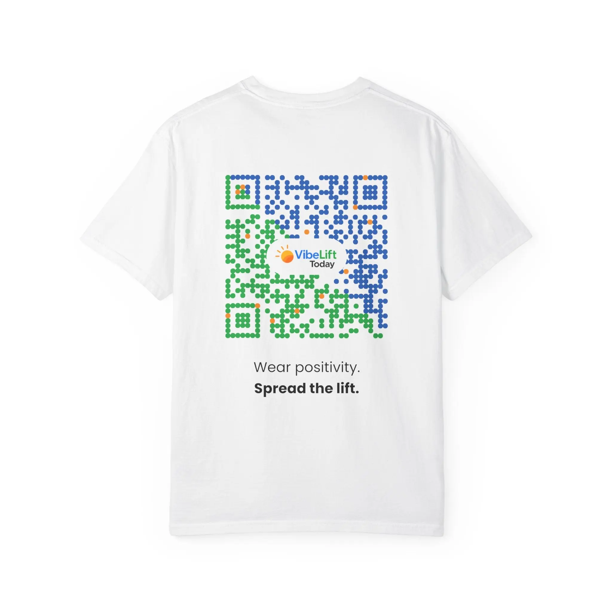 Lightweight but sturdy, this garment-dyed cotton tee carries a quiet optimism you'll reach for every day. A compact VibeLift logo sits on the chest; the back features a colorful QR code and the line "Wear positivity. Spread the lift." When someone scans it, they're greeted with the day's inspirational quote and that day's 365 VibeLift Daily Challenge — a simple positive action paired with words that stick. It's a shirt that delivers a different moment every single day of the year. The relaxed fit and soft, broken-in feel from garment dyeing make it lived-in from the first wear. Sized broadly and finished with thoughtful details, it works for everyday errands, casual meetups, and community events — anywhere a small, human nudge of positivity can spark a smile or start a conversation.