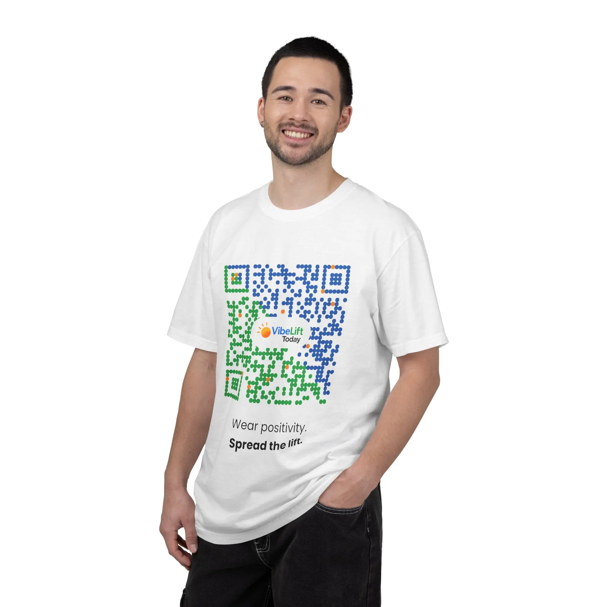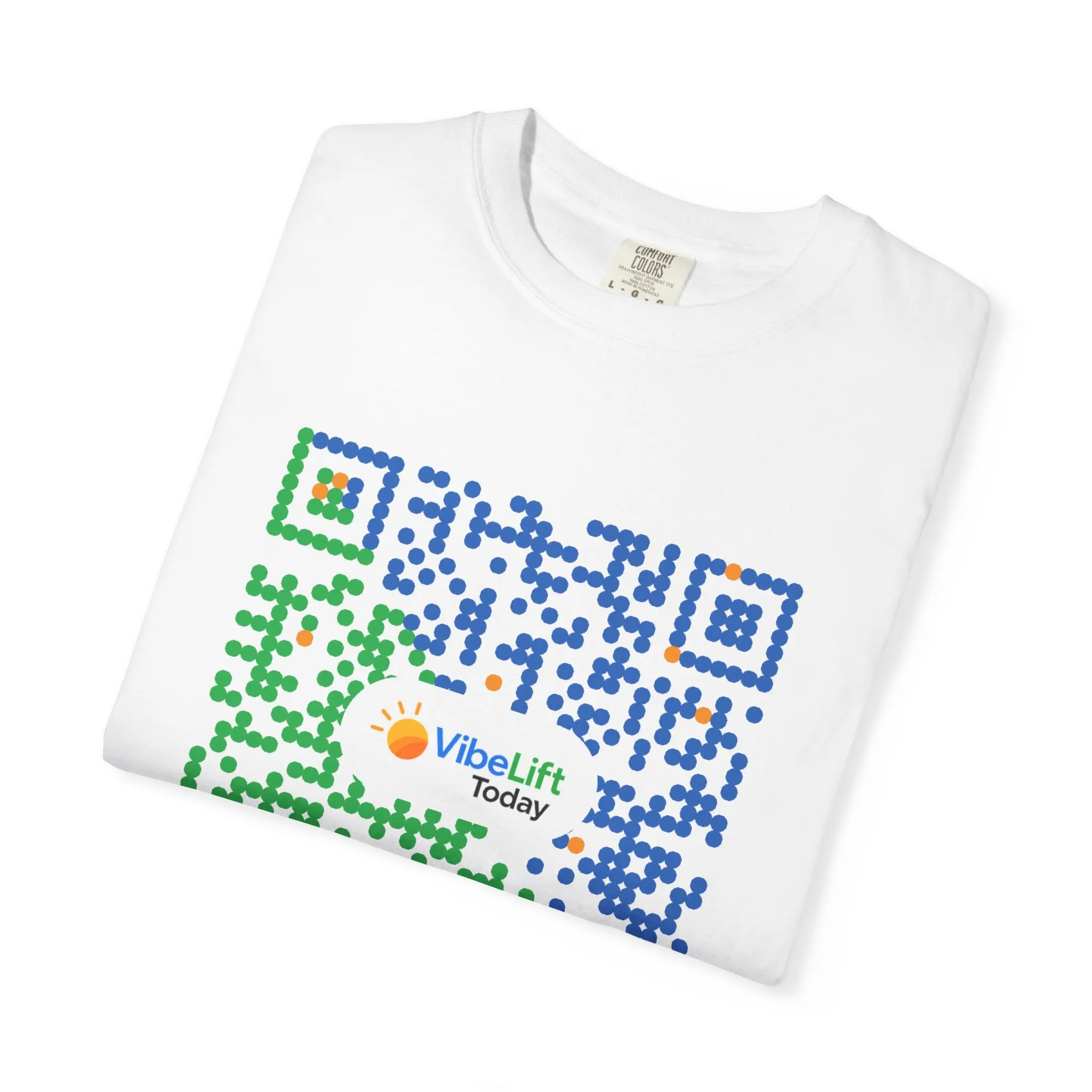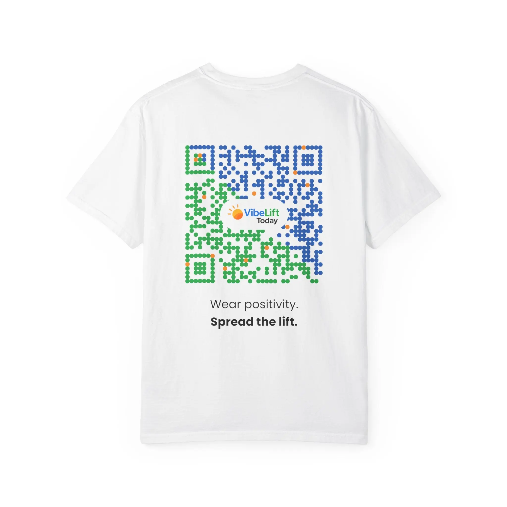 Lightweight but sturdy, this garment-dyed cotton tee carries a quiet optimism you'll reach for every day. The front and back features a colorful QR code and the line "Wear positivity. Spread the lift." When someone scans it, they're greeted with the day's inspirational quote and that day's 365 VibeLift Daily Challenge — a simple positive action paired with words that stick. It's a shirt that delivers a different moment every single day of the year. The relaxed fit and soft, broken-in feel from garment dyeing make it lived-in from the first wear. Sized broadly and finished with thoughtful details, it works for everyday errands, casual meetups, and community events — anywhere a small, human nudge of positivity can spark a smile or start a conversation.