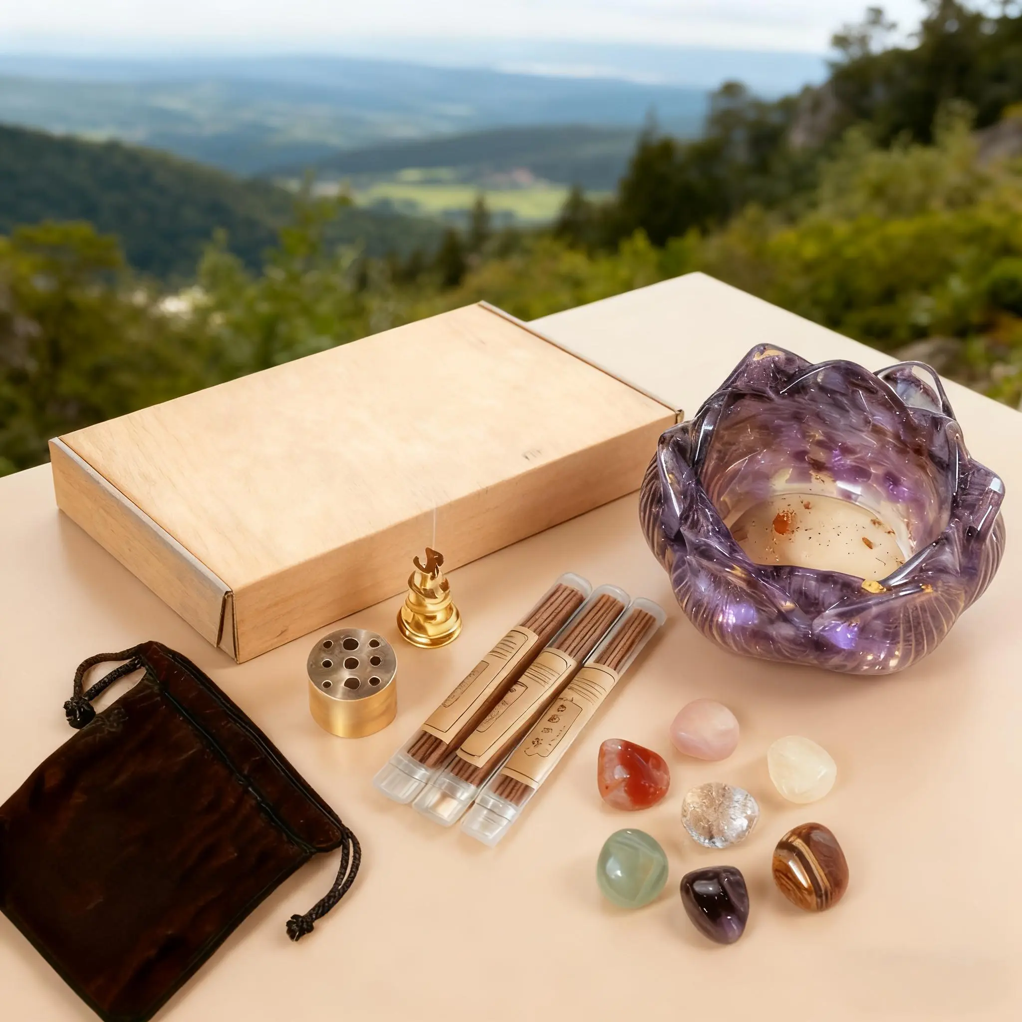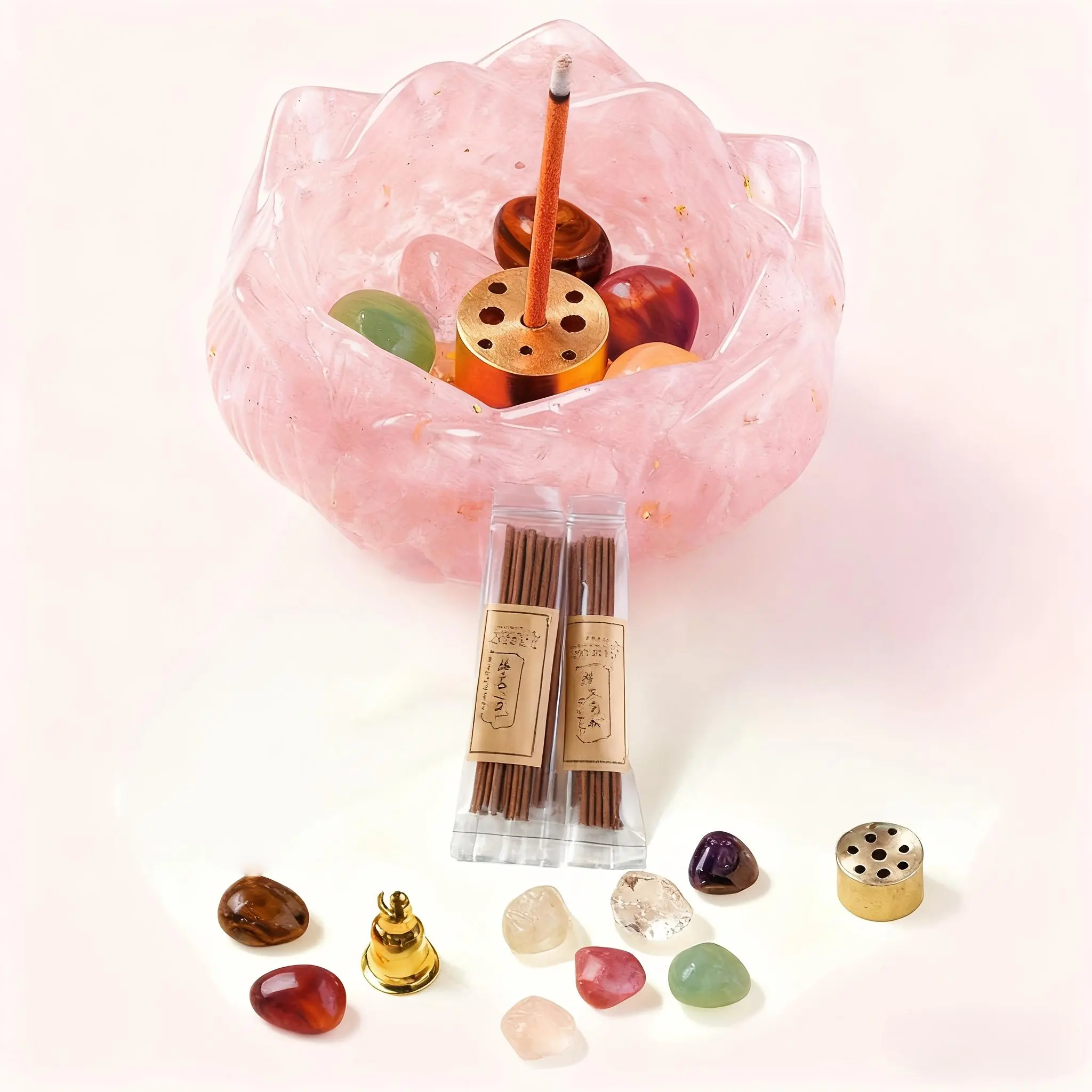 This complete set includes a lotus incense bowl, a brass incense holder, 7 chakra tumbled stones, and 2 packs of incense sticks. It serves as both an incense burner and a crystal display, perfect for meditation, yoga, or spiritual rituals.