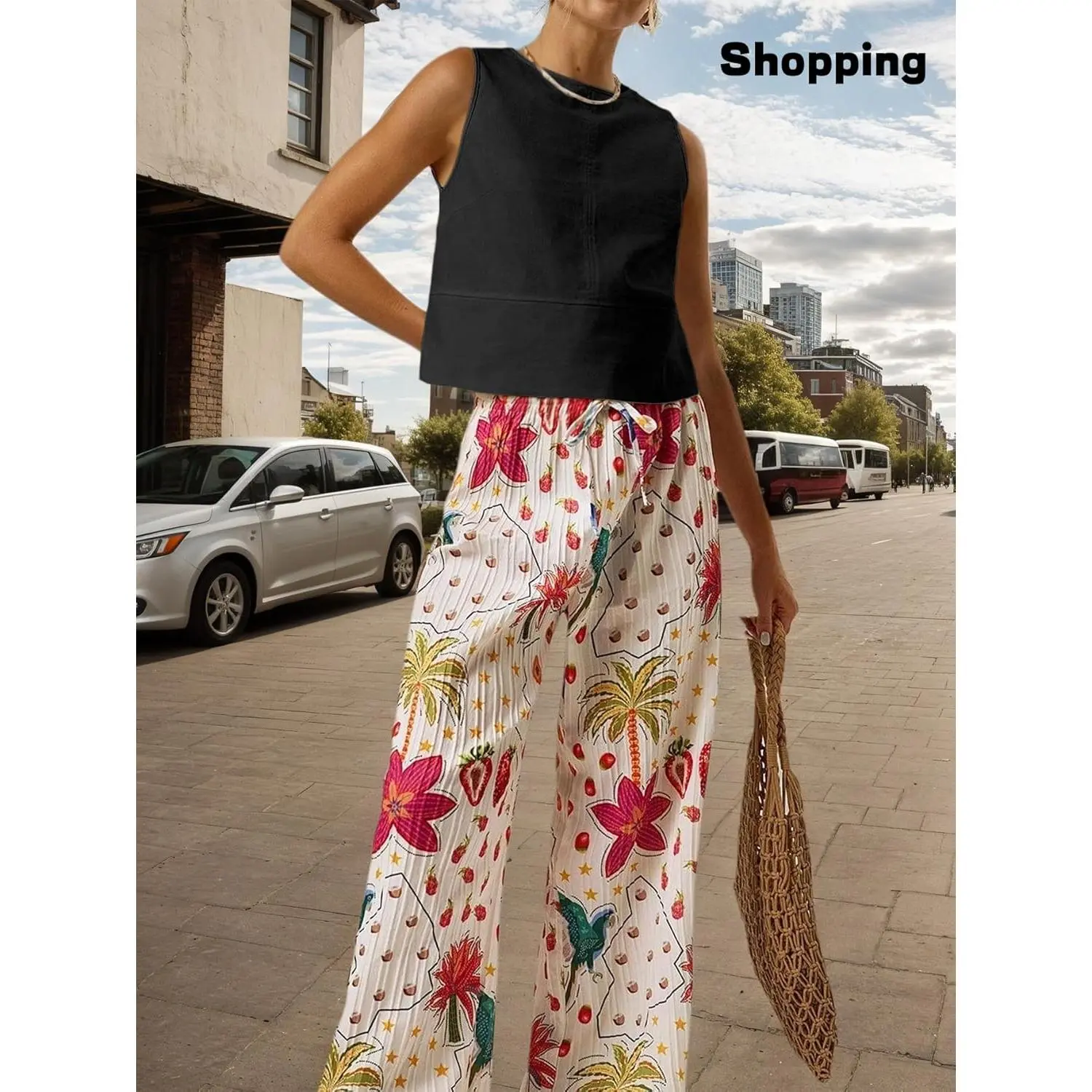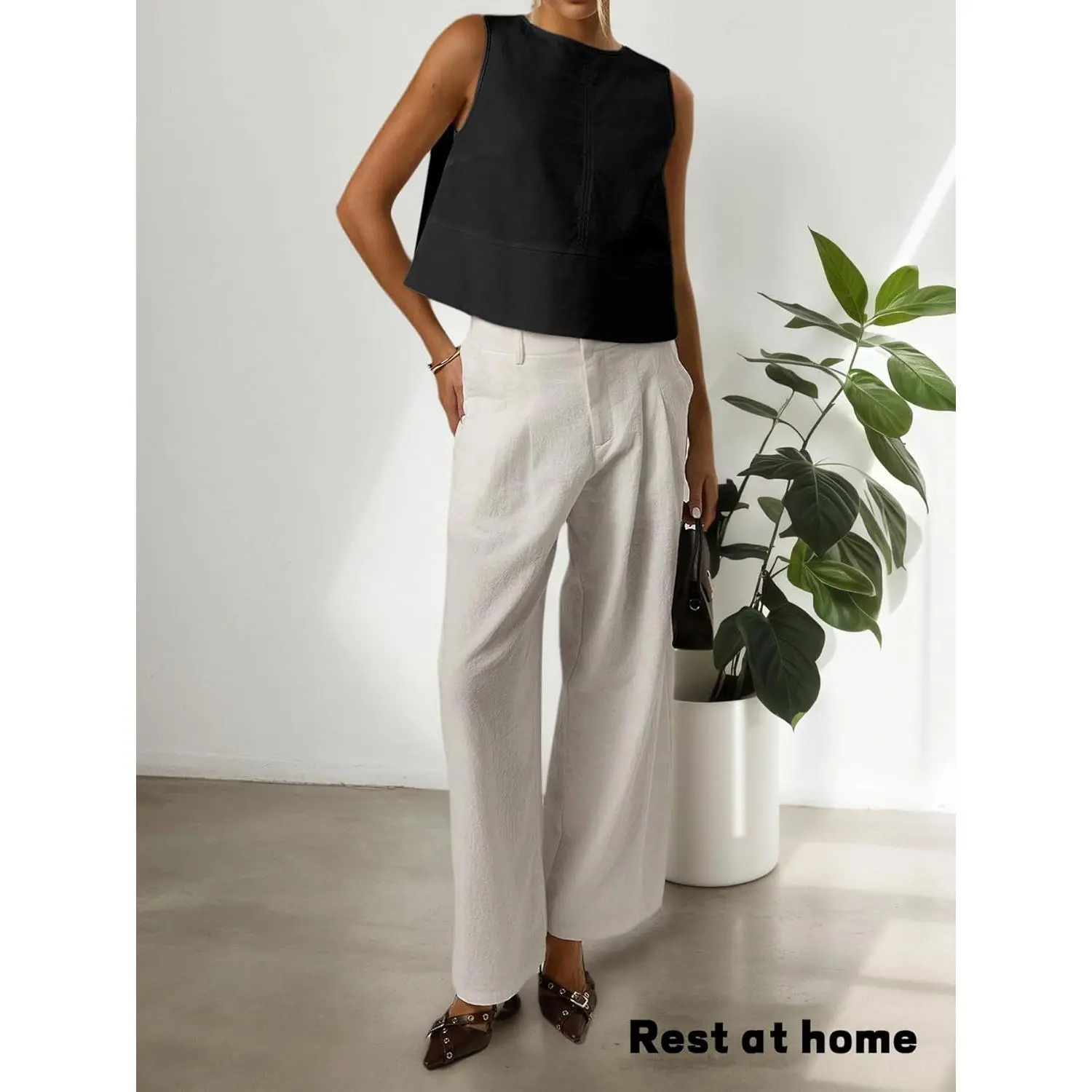 ANRABESS Women's 2 Piece Outfits Square Neck Linen Sleeveless Tank Crop Top Wide Leg Pants Matching Lounge Set Summer Tracksuit Casual Womenswear