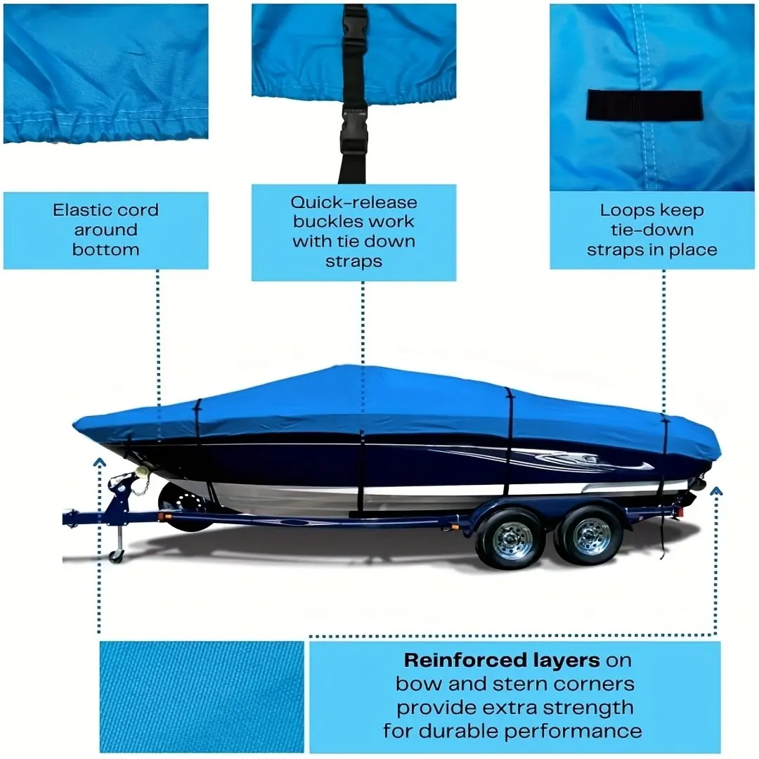 900D Boat Cover, Fade-Resistant and Tear-Proof, Full Metal Accessories, Suitable for V-Hull, Trimaran, Small Speedboat, Blue