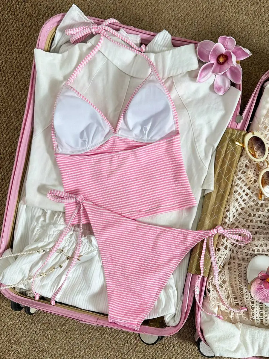 COCOMAY Women's Summer Beach Pink & Brown 2 Pieces Bikini Set, Triangle Halter Top Paired With Square Cut Bottoms, Sexy & Charming, Suitable For Women, Holiday Pool Party Fashionable Swimwear Vacation