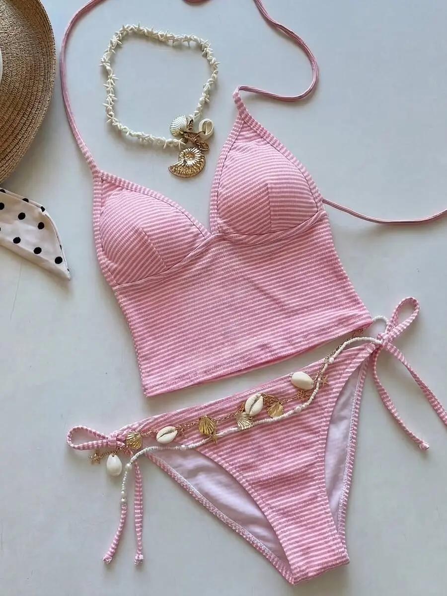 COCOMAY Elegant Vacation Sweet Women's Spaghetti Strap Bikini Set With Pink & White Fabric, Pearl & Seashell Decorations, Wireless