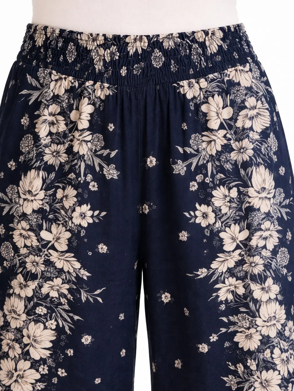 ·Floral Print Detail: The ivory floral print stands out beautifully against the deep navy base.