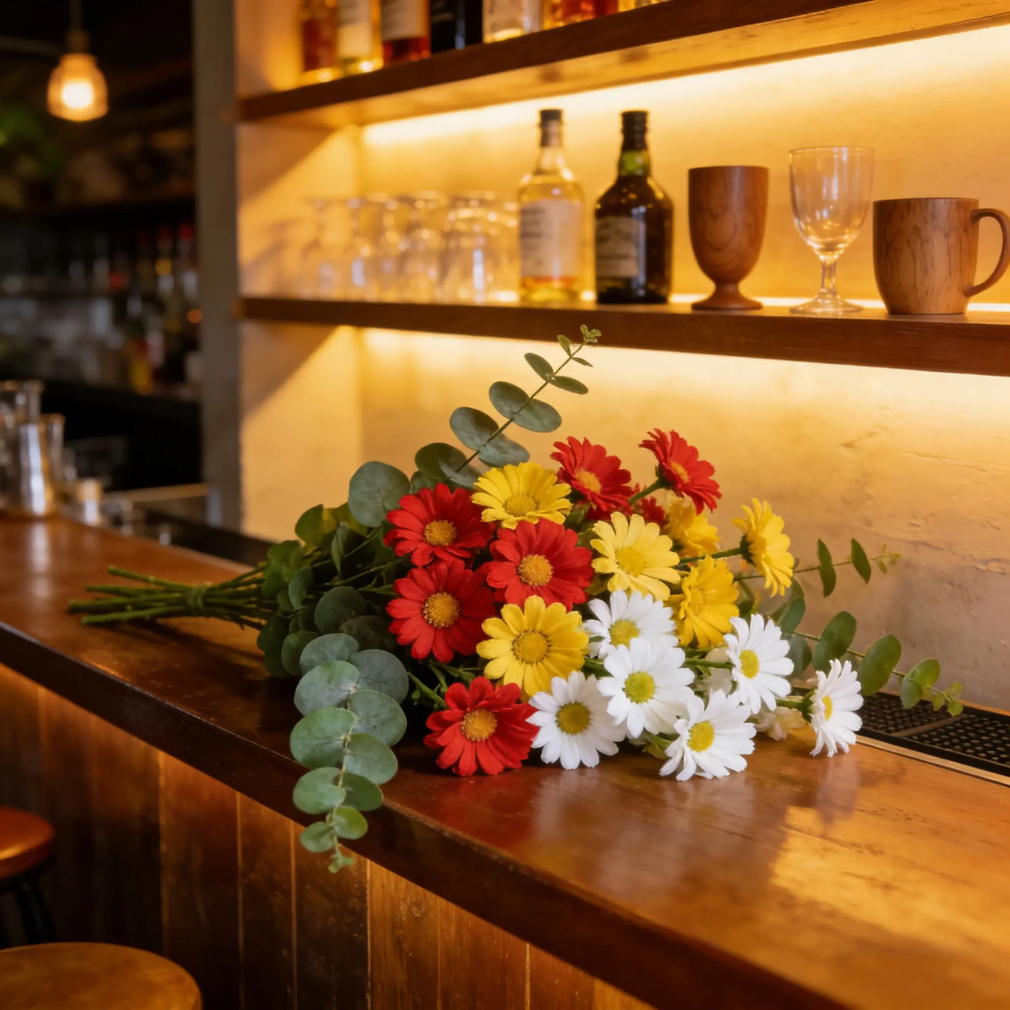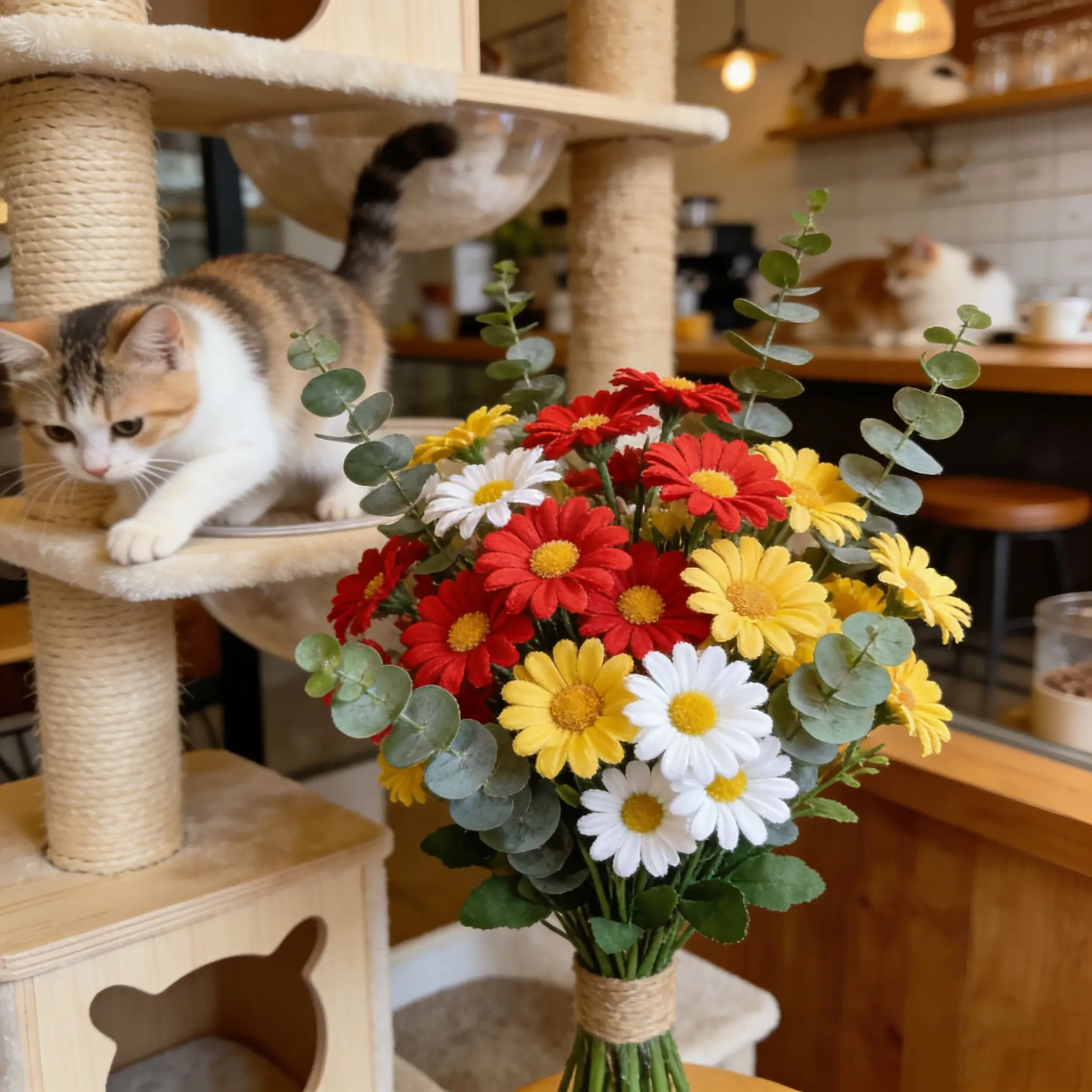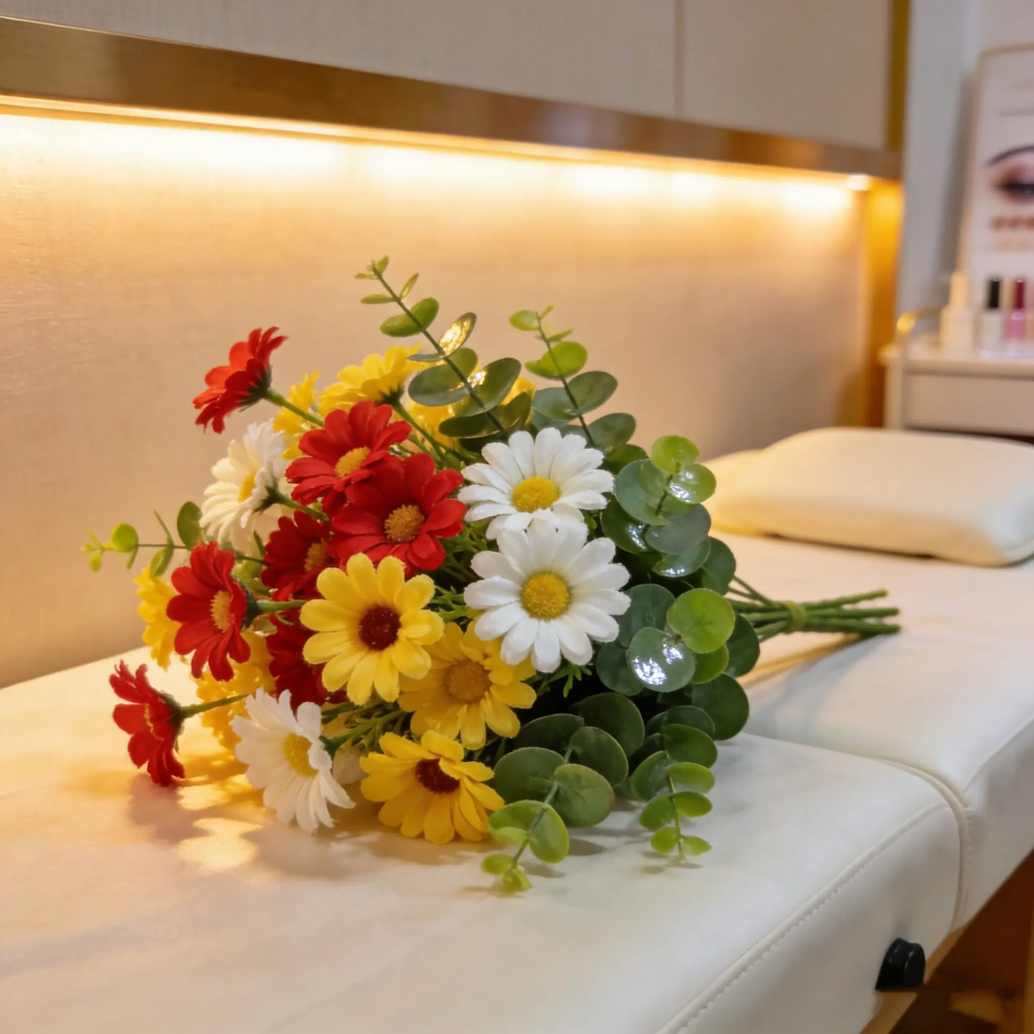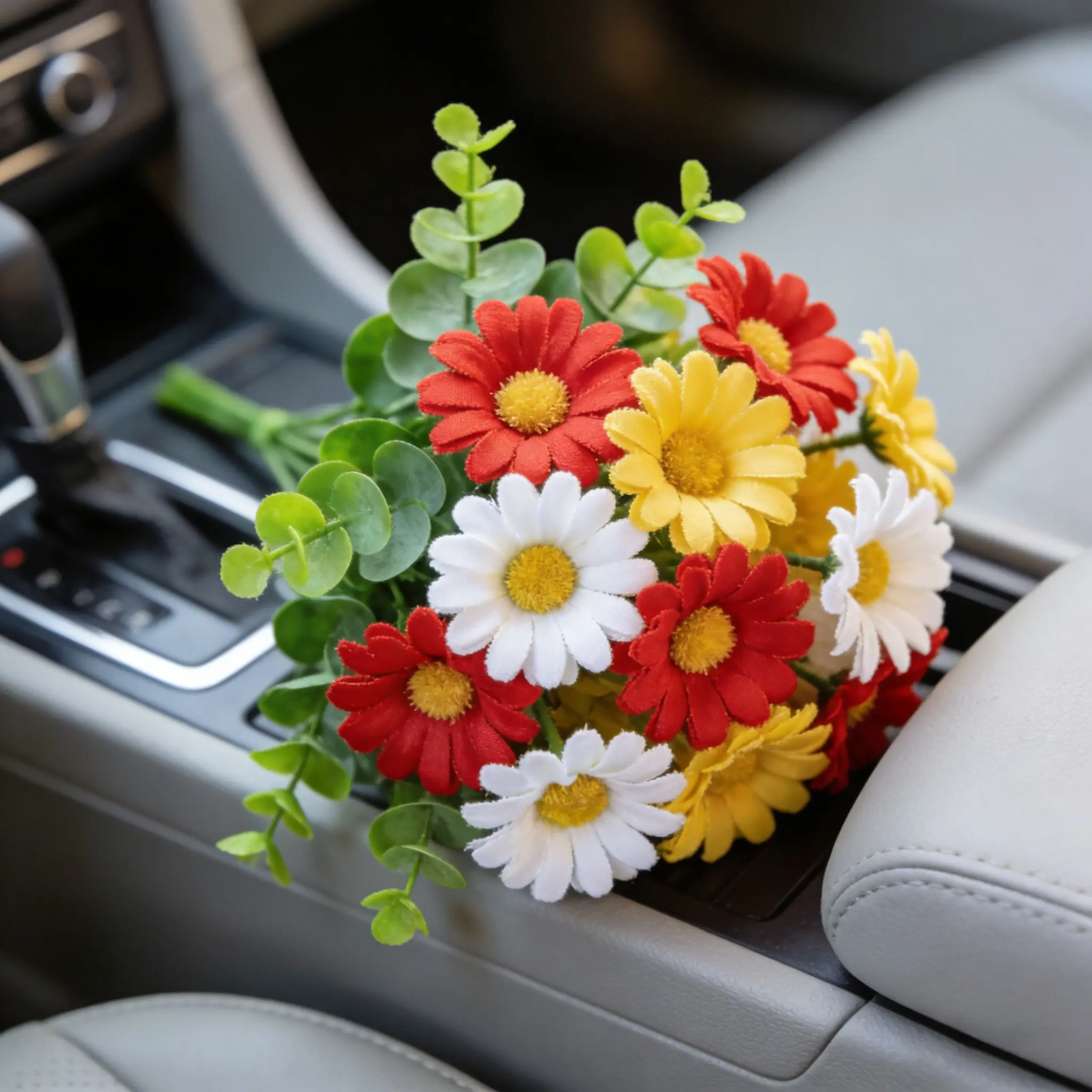 【Color Variety】: Includes red, yellow, white daisies and fresh eucalyptus leaves for a vibrant look.