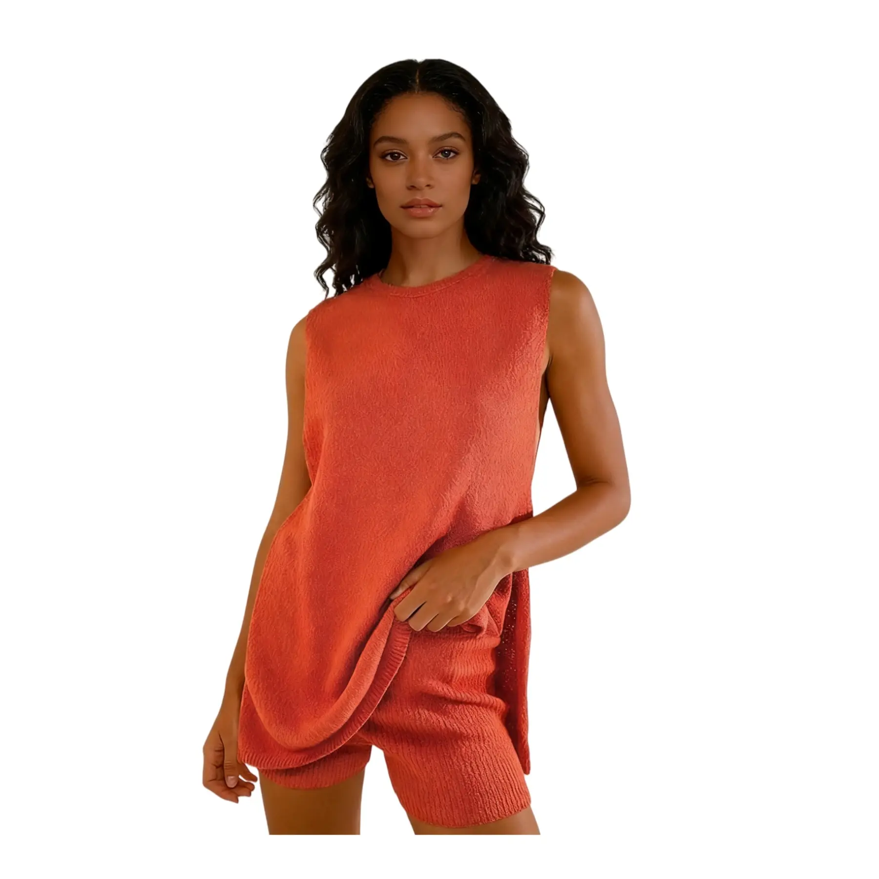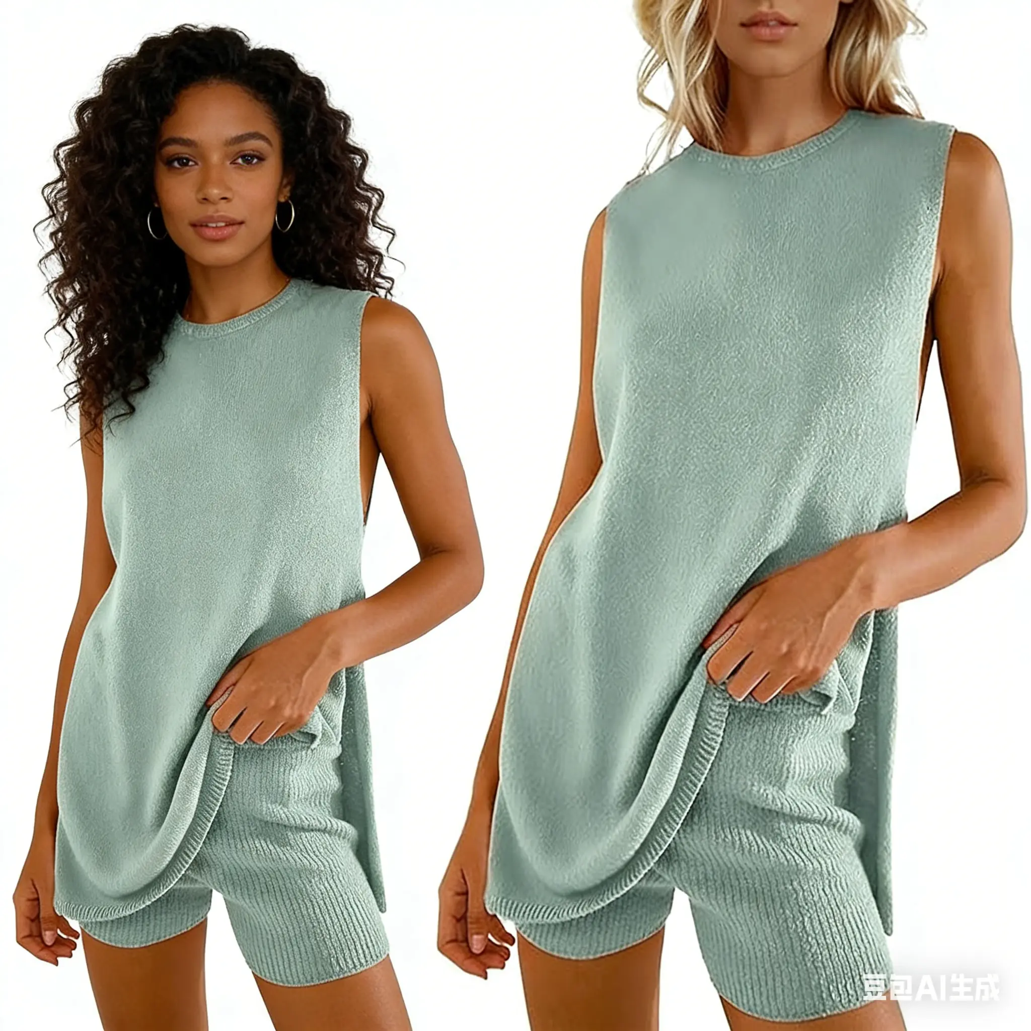 Design: Casual tunic matching set for women features with high boat neckline, dropped armholes, vented hemline, loose fit sleeveless tunic tops, slim fit throughout shorts, two piece sweater sets for women summer.