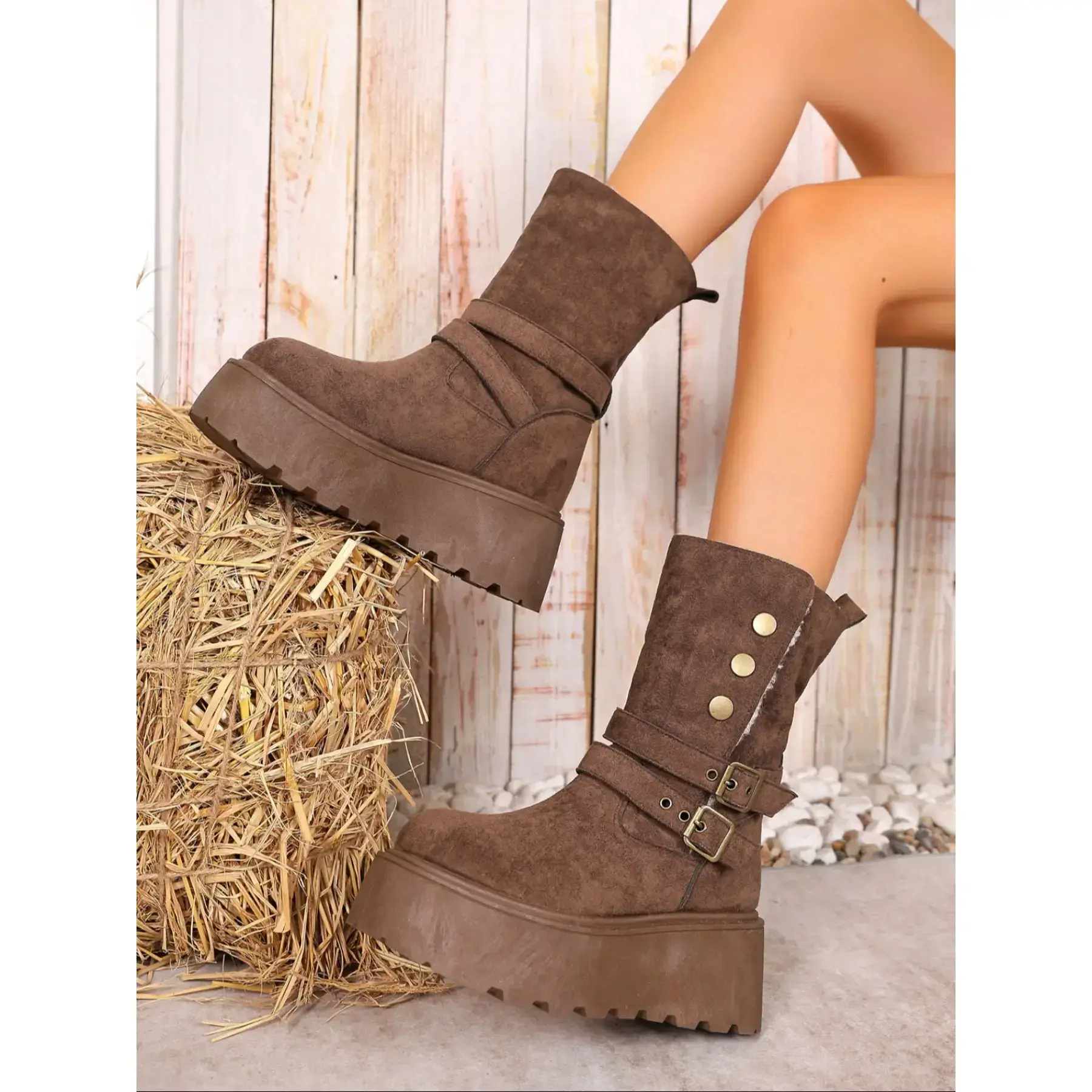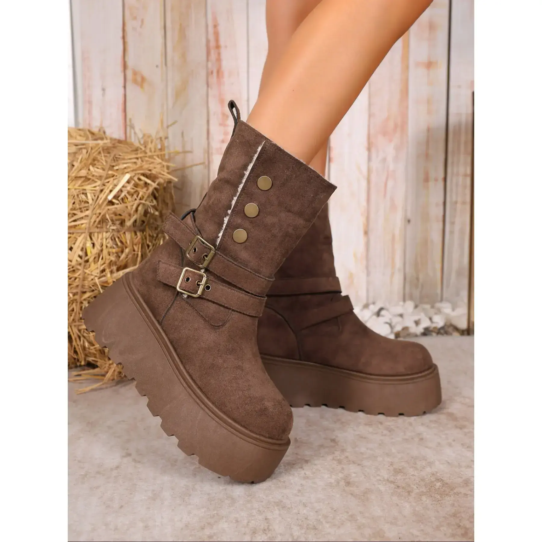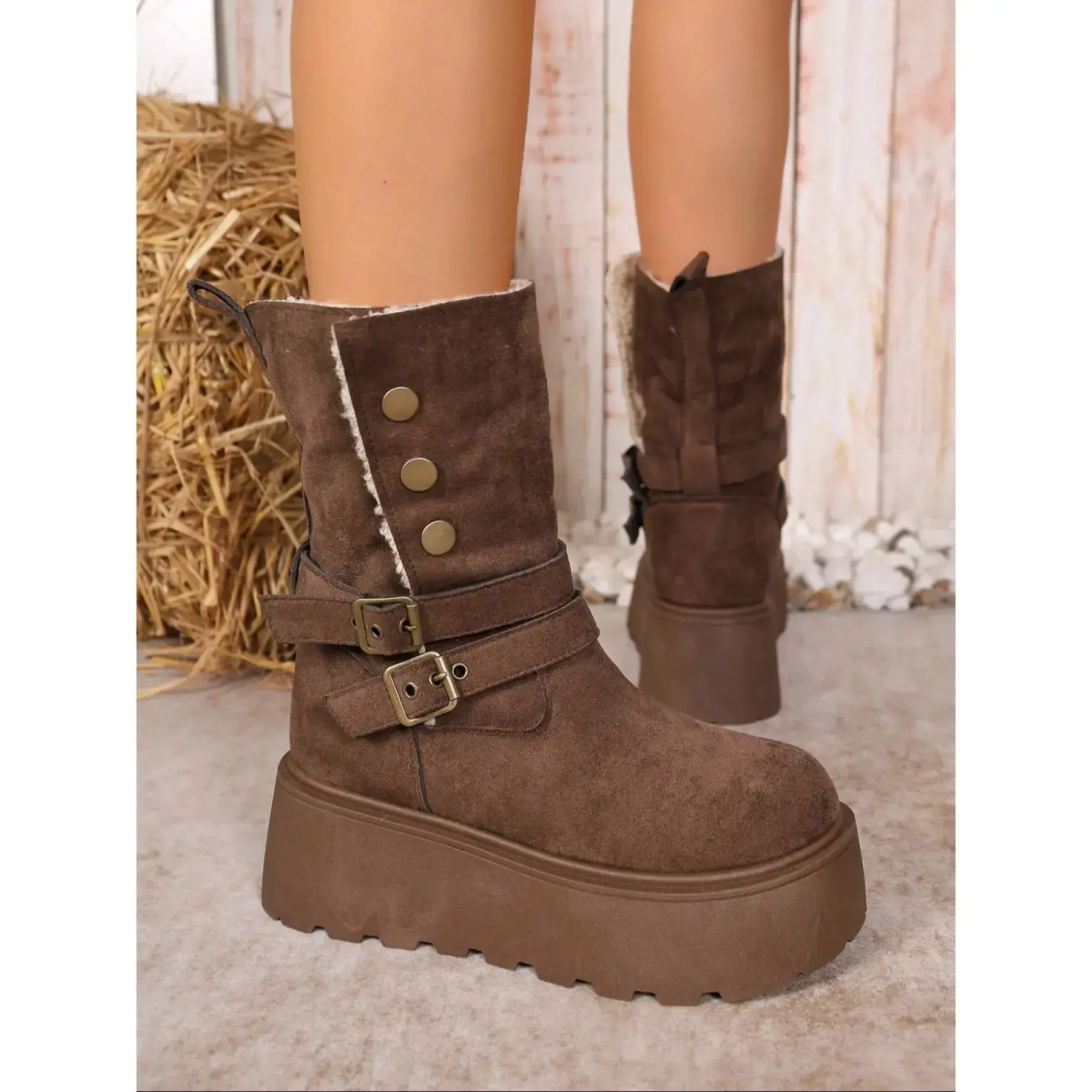 【Warm Lining】: Features plush lining for increased insulation, ensuring your feet stay warm during the cold winter months. 【Unique Buckle Detail】: Distinguished by a stylish belt buckle, adding a retro twist that sets these boots apart from others. 【Non-Slip Sole】: Equipped with a rubber sole, providing reliable traction and stability on slippery surfaces in winter conditions. 【Mid-Calf Height】: These mid-calf boots offer additional coverage and protection against the winter chill, enhancing leg warmth. 【Durable Materials】: Crafted with PU leather and rubber, ensuring longevity and resistance to wear and tear from winter activities.