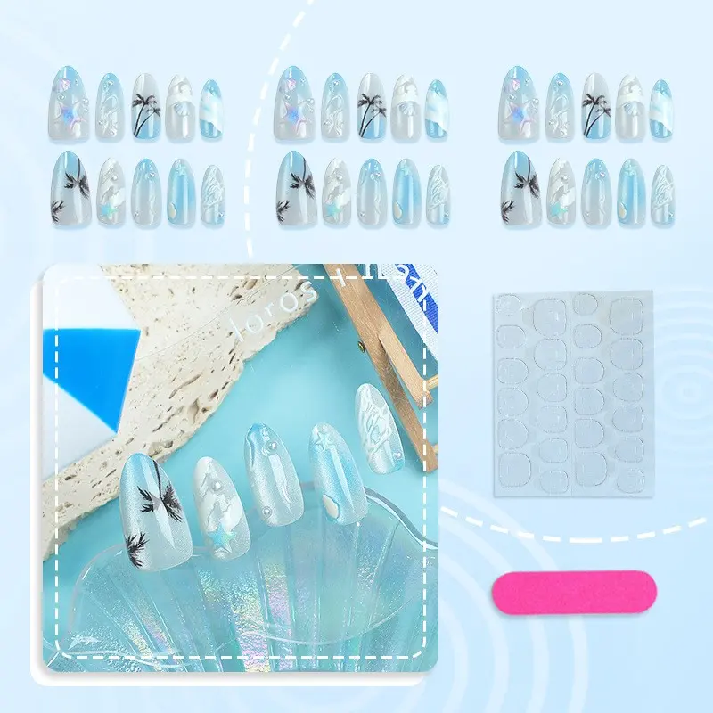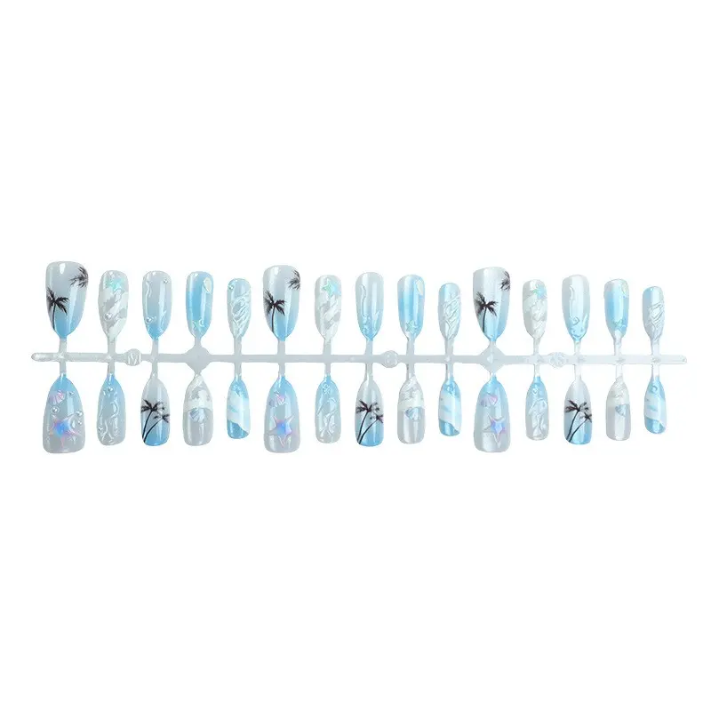 Blue Summer Vacation False Nails, Beach Sand Painted Sea Wave Starfish Shell Nail Art, Wearable Manicure Tips, Single Item Pack