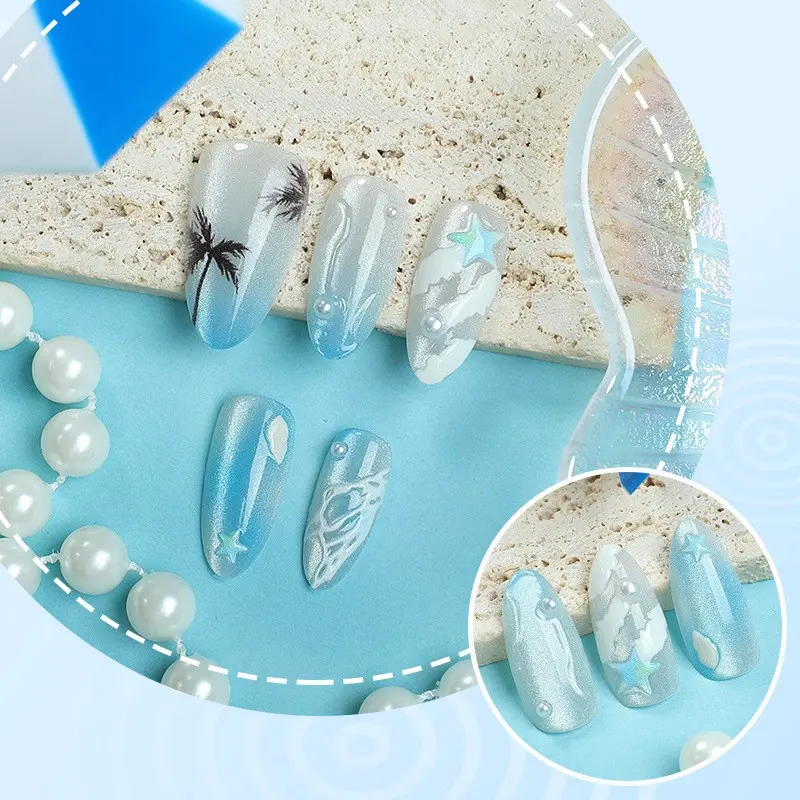 Summer Island Style Blue Cat Eye Nail Tips, 3D Starfish Shell Palm Decor, Transparent Gradient Wave Pattern, Medium-Length Almond Nails