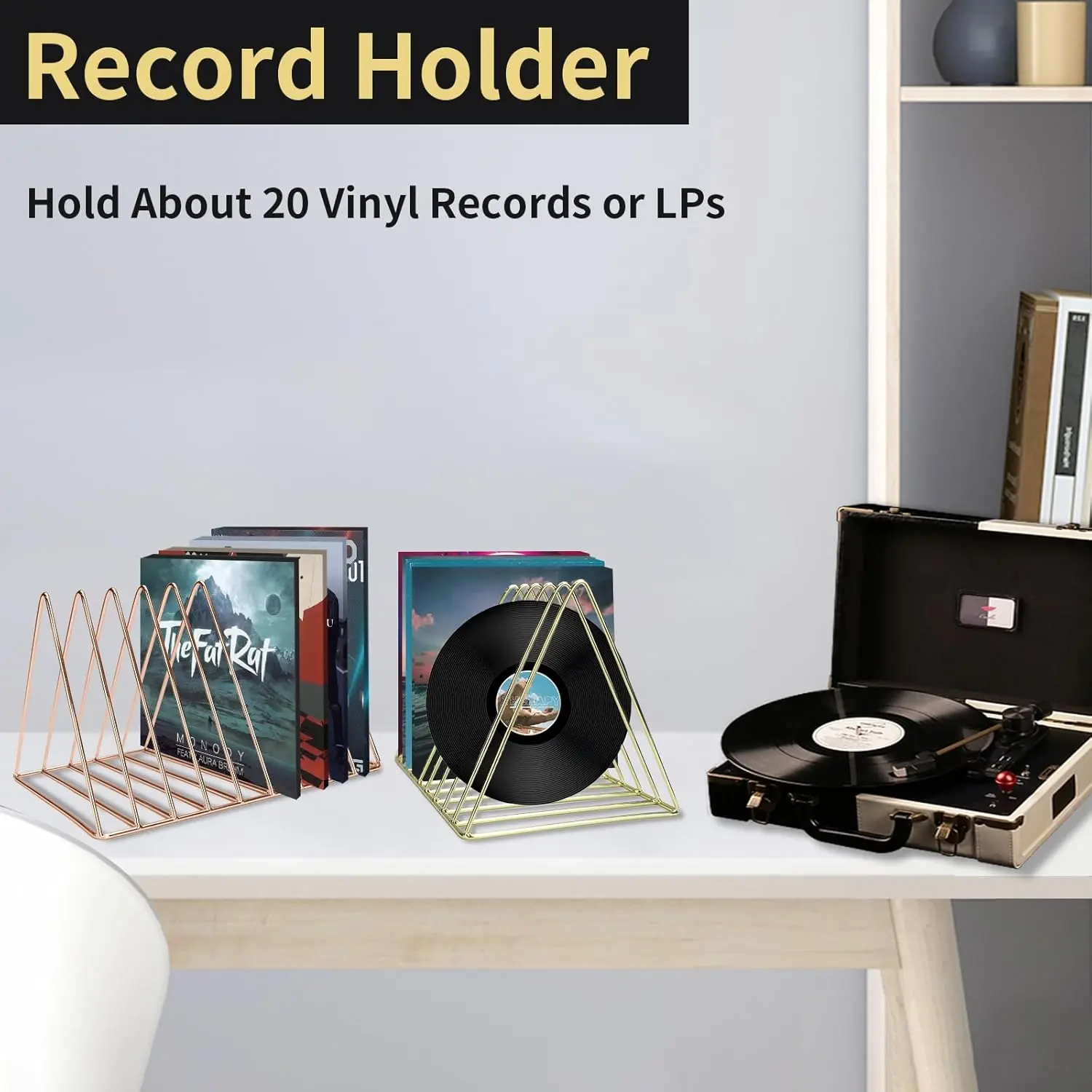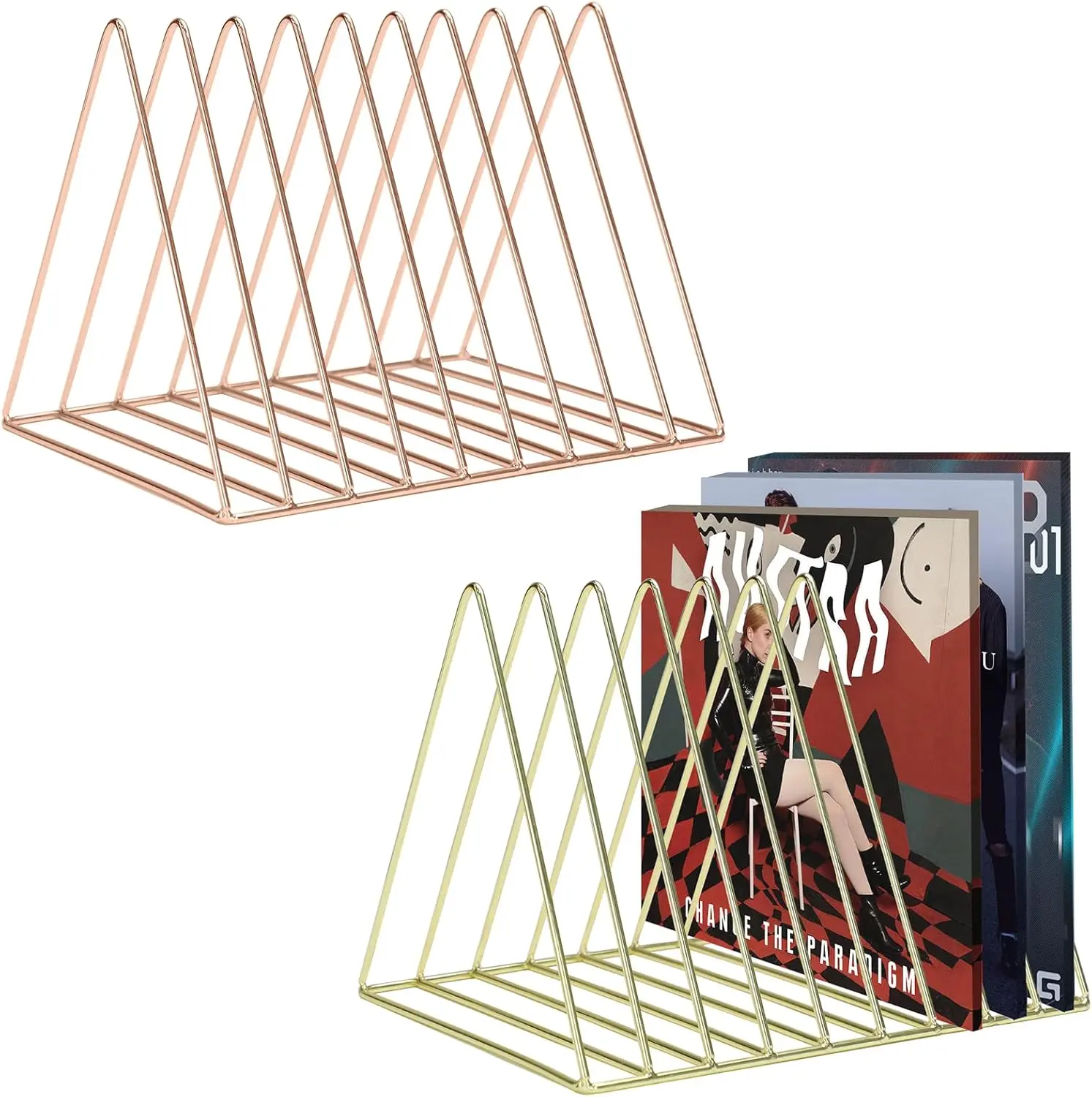 ·【2 COLORS & MORDEN STYLE】 The package includes 2 colors vinyl holders, gold and rose gold. The sleek and minimalist design of the vinyl record stand can add a touch of modernity to home or office. The file organizer can help keep your space looking tidy and organized while be used as photo props or home decoration.