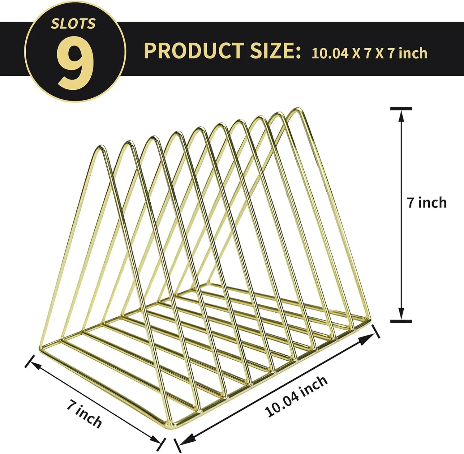 ·【9 SLOTS & PRODUCT DIMENSION】 The record organizer has 9 sections, with a distance of 1 inch between each slot, providing enough space for storage. Product size: 10.04 x 7 x 7 inch.