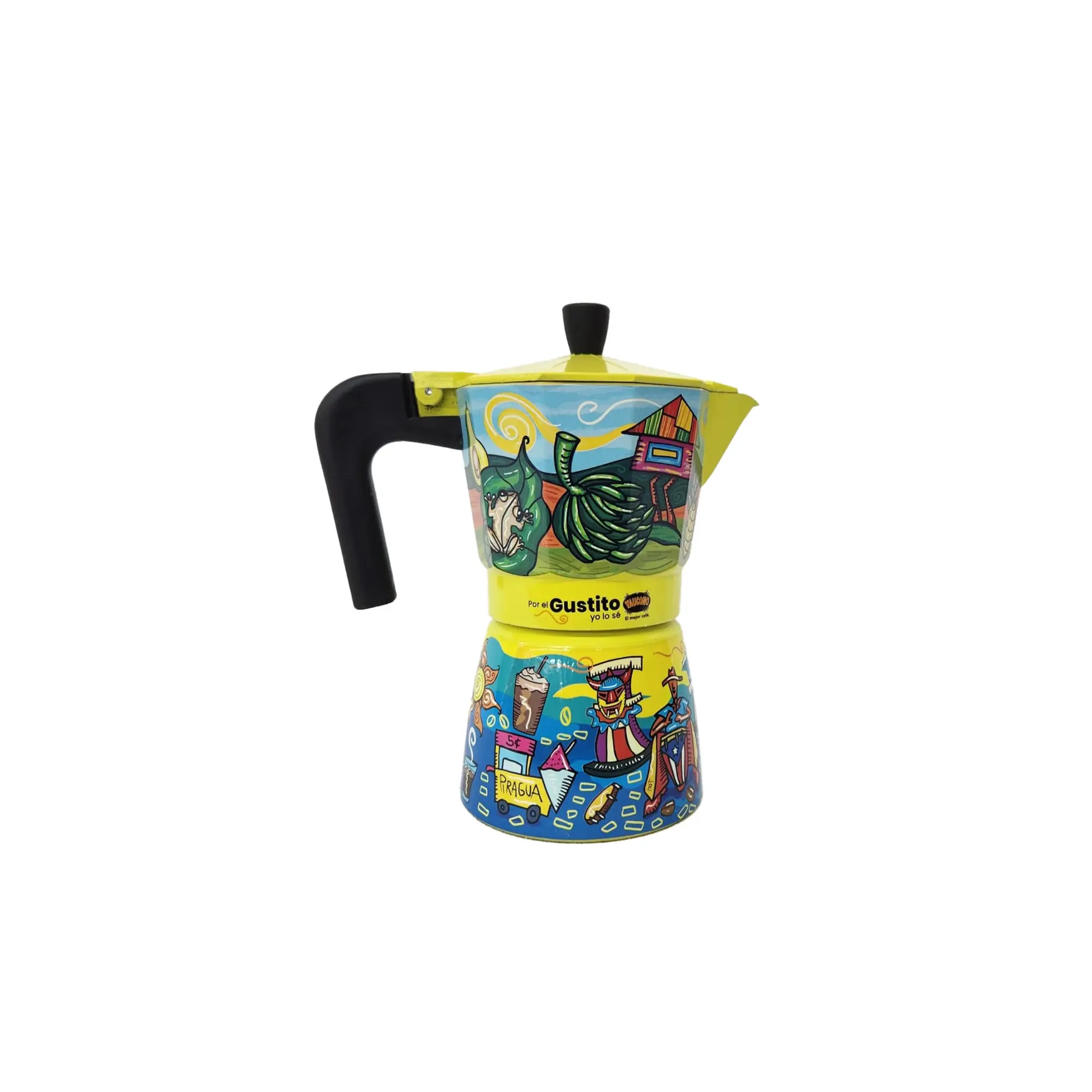 This coffee pot has been created by the Puerto Rican artist, Héctor J. Soto Ramos, a piece of art in every corner of this Coffe pot. Beautifully painted with green plantains, the coquí, the sun, "Piraguas", "Panderetas, turtle, and more! Just a constant reminder of Puerto Ricos beauties and traditions.