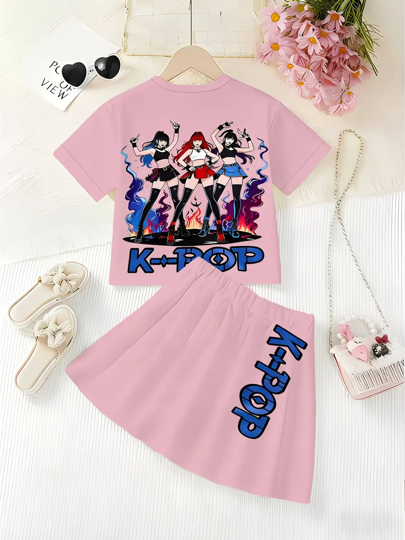 Girls' Summer Casual, Cartoon Anime 3D Print, Fashion Round Neck Short Sleeve Top + Skirt, Comfortable Summer Clothes for Kids