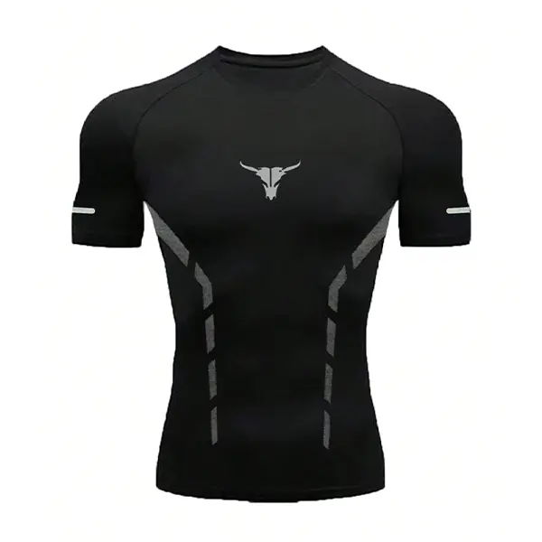 ·Top: iconic bull head print at the front + geometric lines on the sides for a trendy look; reflective stripes at the cuffs enhance safety during night runs; crew neck that fits snugly without choking, retains shape even after prolonged wear.