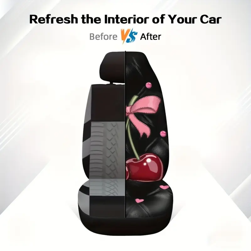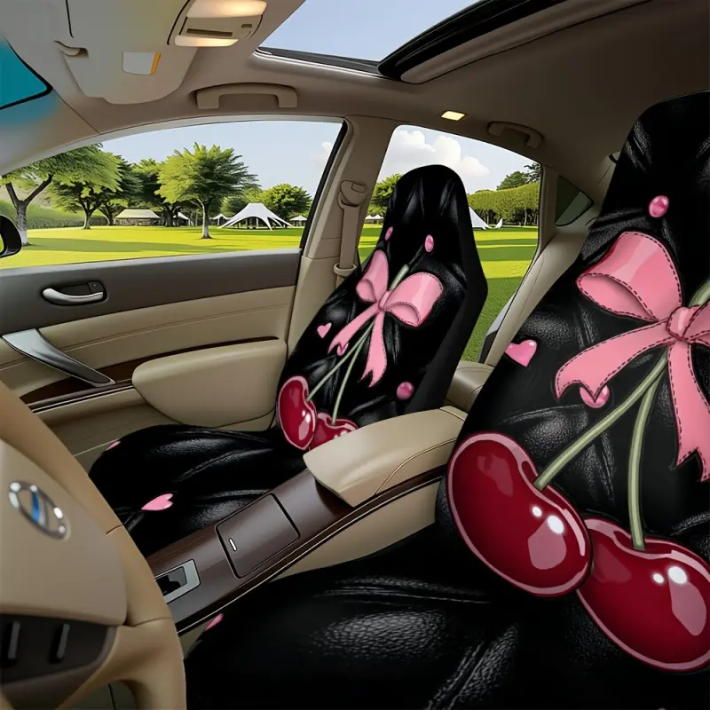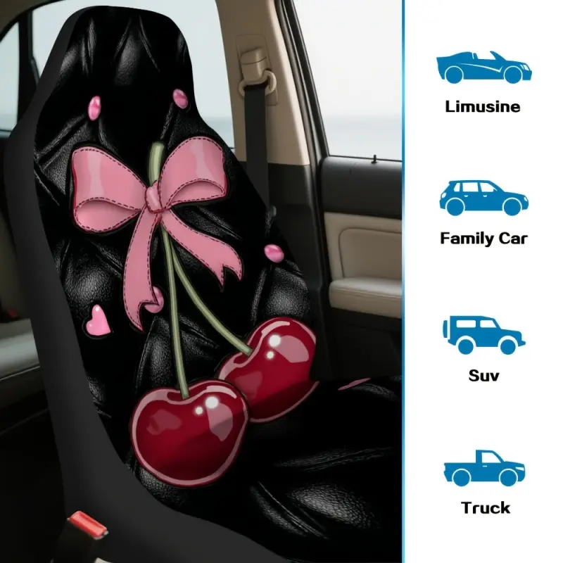 Two-piece cherry design, pink bow on a black background for the front seat cover. Perfect for individual front car seats. It is a practical gift suggestion for vehicle operators and owners.