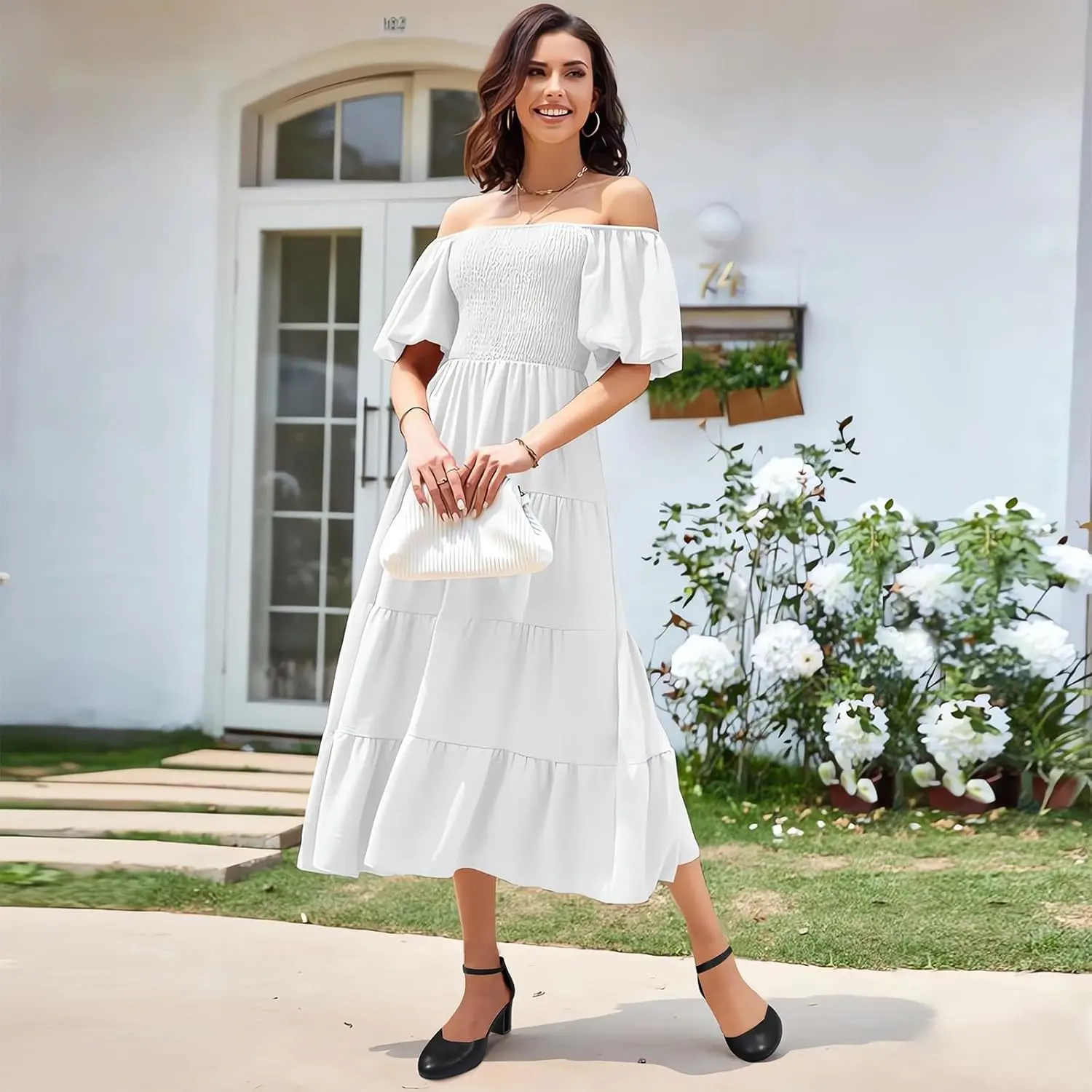 [Restocked] AUSELILY Women's Off The Shoulder Dress Wedding Guest Dress Summer Casual Long Ruffle Party Side Split Beach Maxi Dresses with Pockets