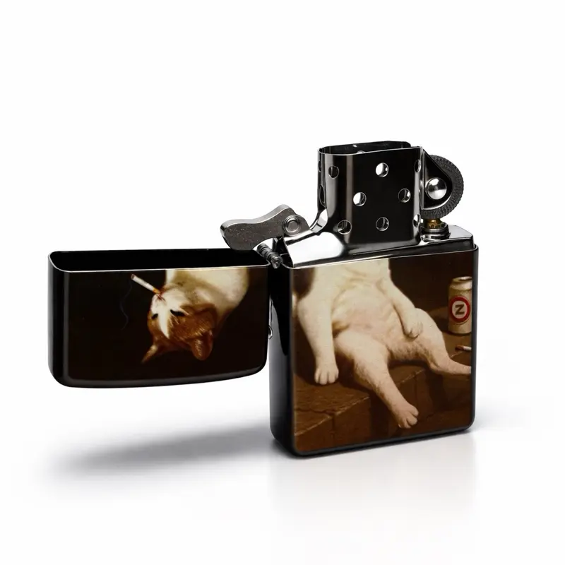 Add some personality to your everyday carry with this unique smoking cat lighter featuring a humorous vintage-style cat artwork. The design shows a relaxed cat enjoying a cigarette and drink, making it a great conversation piece or gift.