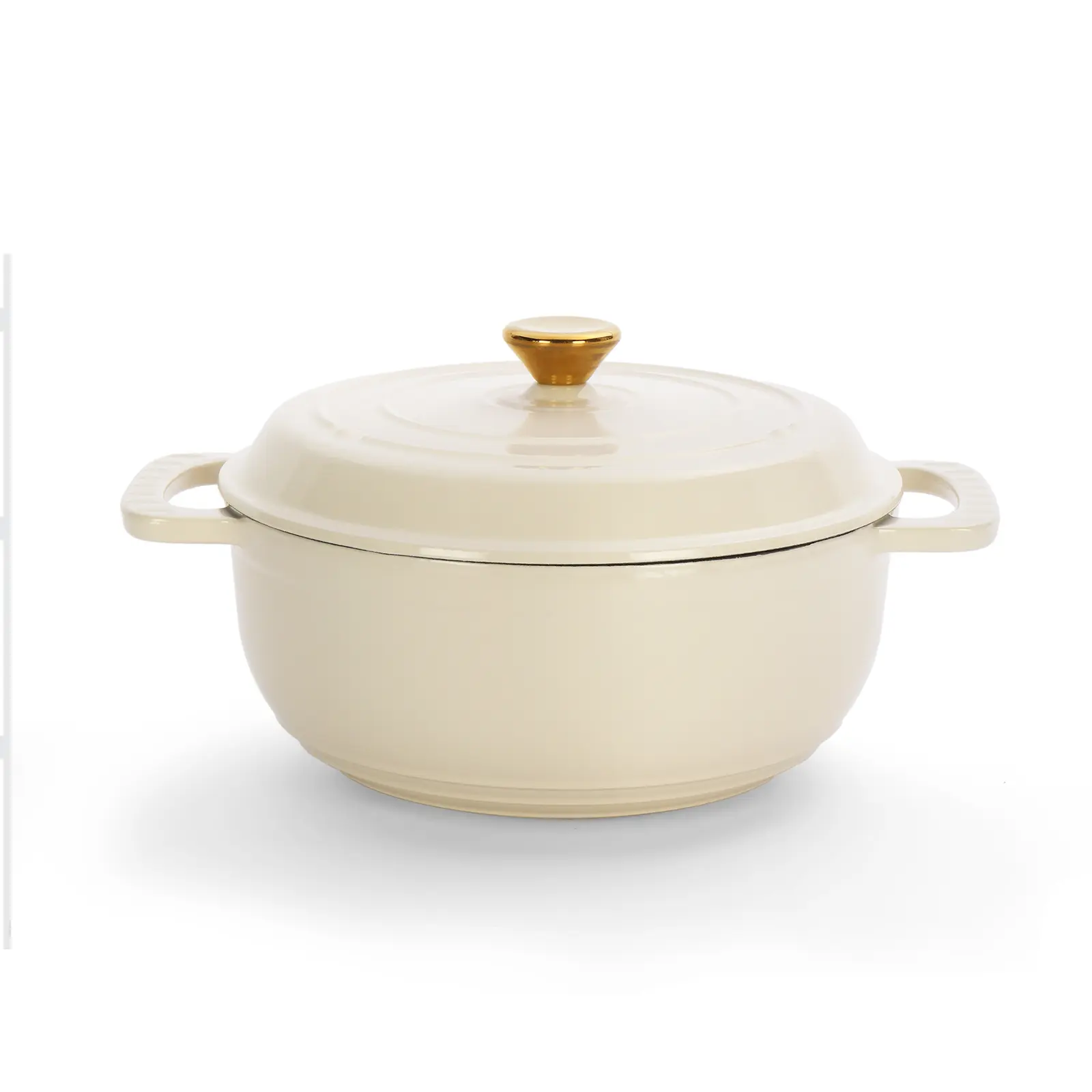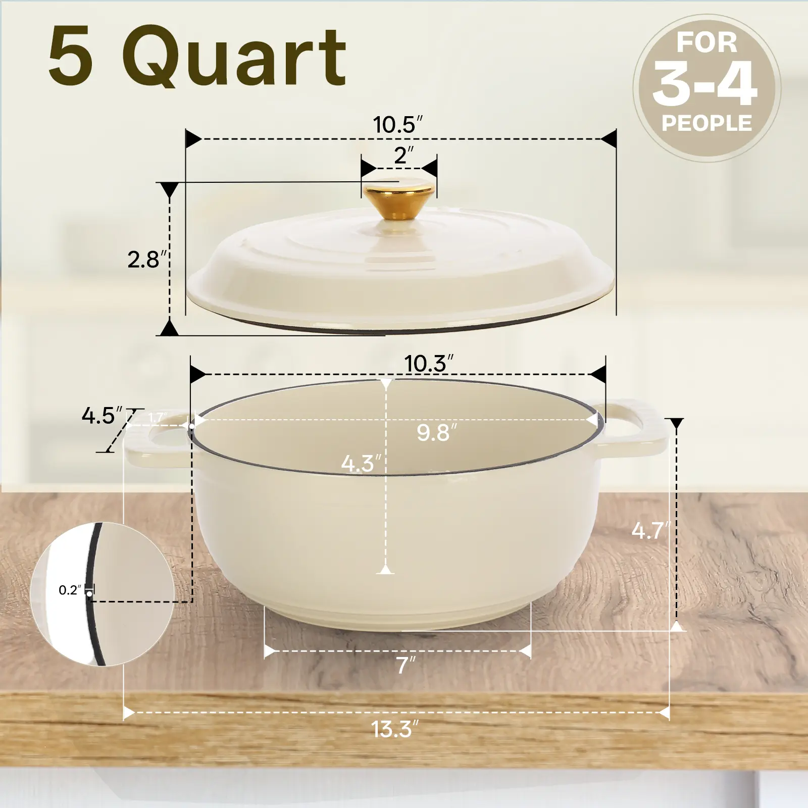 Elevate your cooking with this heavy-duty cast iron pot. It features a ceramic white enamel coating, ensuring a high-gloss finish and non-stick interior. The pot holds 5 quarts (4.7 liters) and measures 13.5"W x 11.1"D x 4.7"H. Weighing 12.1 lbs, it's oven/broiler safe up to 500°F (260°C). Compatible with gas, electric, ceramic, and induction cooktops. The self-basting cast iron lid locks in moisture and flavors. Hand wash only; avoid metal utensils and citrus-based cleaners.